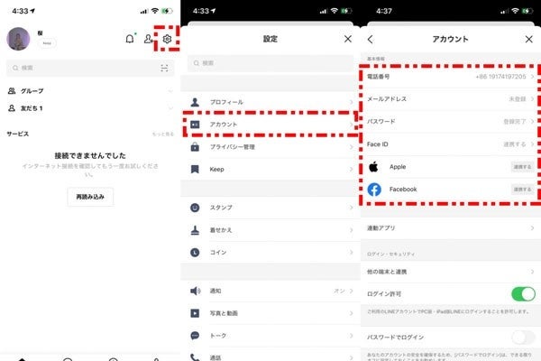 ステップ2:アカウントの中にある「電話番号」「メールアドレス」「パスワード」「Apple」「Facebook」をすべて画面の指示通りで入力、関連します。