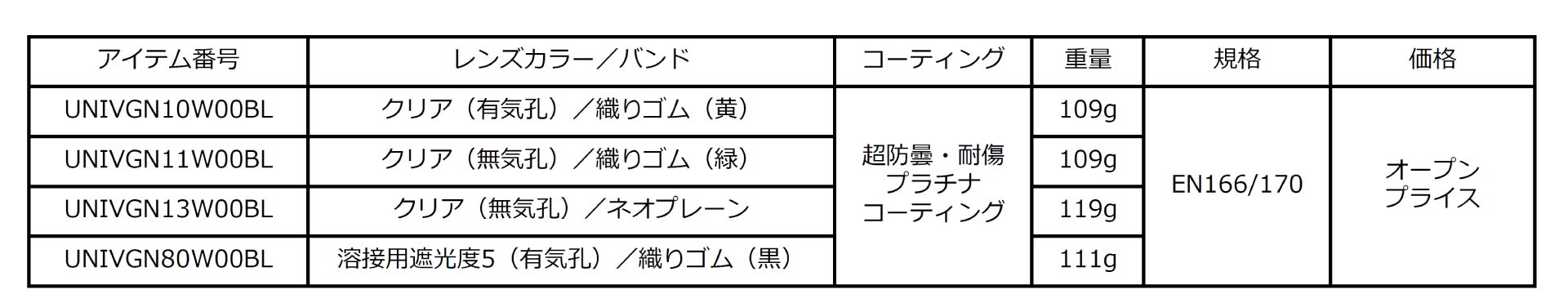 飛来・落下物による眼の負傷が多い建設業や製造業向けには黄色の有気孔タイプを、化学物質から顔面全体を守る必要がある化学・食品産業向けには緑の無気孔タイプを、溶剤・酸使用現場には高いフィット性のグレーのラバーバンド無気孔タイプを、さらに溶接作業には遮光度5のスモークレンズの有気孔タイプと、業種別や作業内容に応じた4種類をラインアップしています。