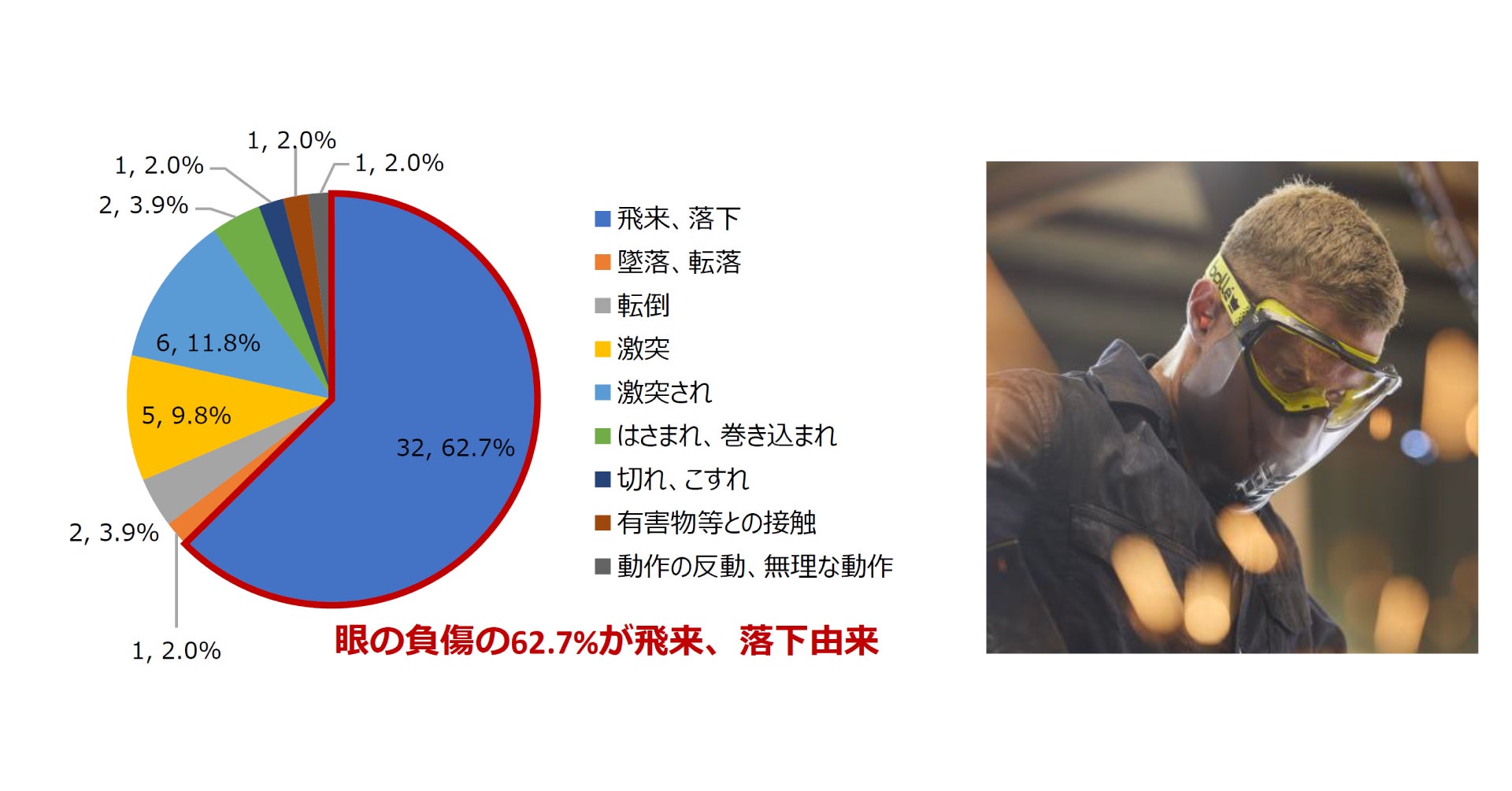 厚生労働省が公開する労働災害原因要素の分析(令和2年)によると、建設業では年間83名(全体の2.1%)が顔面(顔+目)に被害を受けており、そのうちの46%(38件)が飛来・落下要因によるものです。特に眼の負傷については、全51件中32件(62.7%)が飛来・落下が原因であり、適切な保護具の着用によって防げた可能性が高いと考えられます。