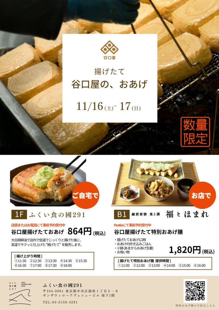 ALL FUKUI が共同運営する食とビジネスの交流拠点、福井のアンテナショップ「ふくい食の國291」(銀座)において、11月16日(土)17日(日)揚げたての「谷口屋の、おあげ」を堪能できる特別おあげ膳を数量限定で提供いたします。