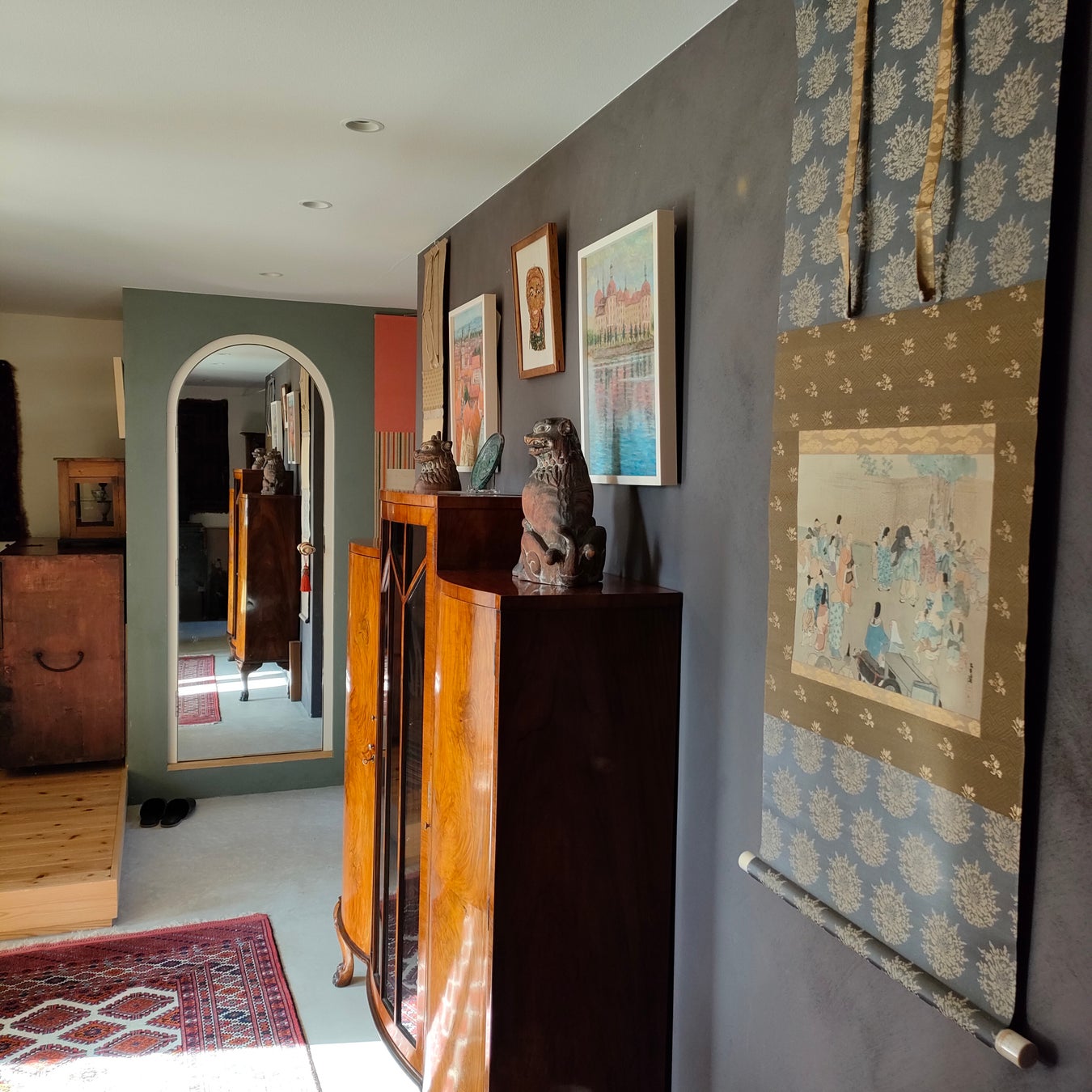 「美術館のような空間に住まう」をテーマに設計された自邸の1階スペースを使い、ヨーロッパのアンティーク家具や民藝家具を設えた空間に、古美術や現代アート作品を常時30点ほど展示販売しています。建築デザインは国内外のAWARD※を受賞しています。