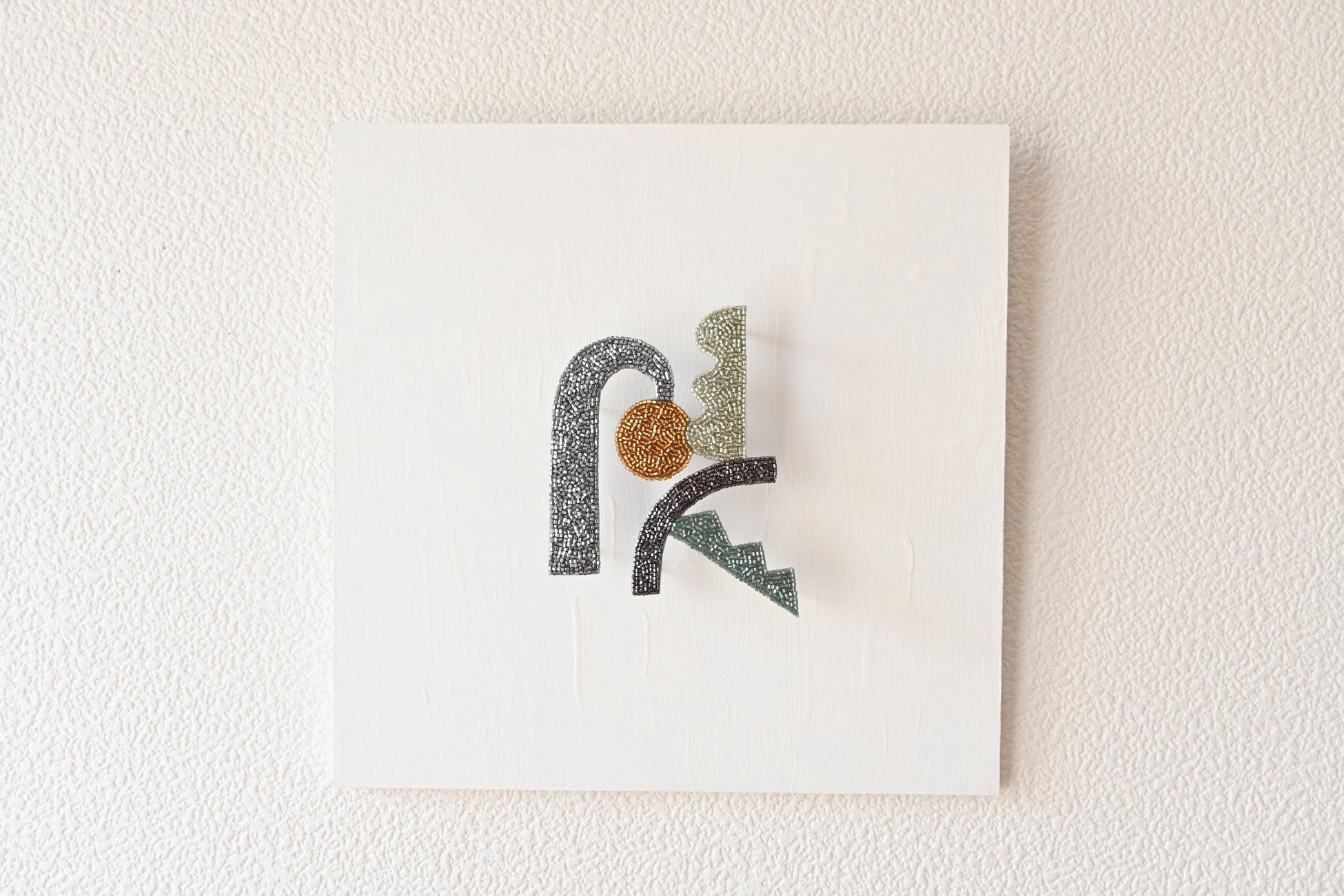 作品の特長は、刺繍モチーフが幾何学模様であることです。これは、「空間に少し違和感を与える」考えによるもので、エッジの効いたデザインと伝統技法が相まって、飾ることでエスプリの効いた空間を演出します。また、刺繍のオブジェを支持体から少し浮かせて設置することで、オブジェの影が落ち、光と影の立体的な効果を生み出しています。今展では、代表作である壁掛けオブジェ24点が出品されます。また、壁掛けオブジェのほかに、蓋もの、ランプシェード、卓上モビールなど様々なビーズ刺繍作品も展示販売いたします。デザイン建築空間ならではの展示をお楽しみください。11月23日(土・祝)には、佐藤氏による刺繍実演もご覧いただけます。