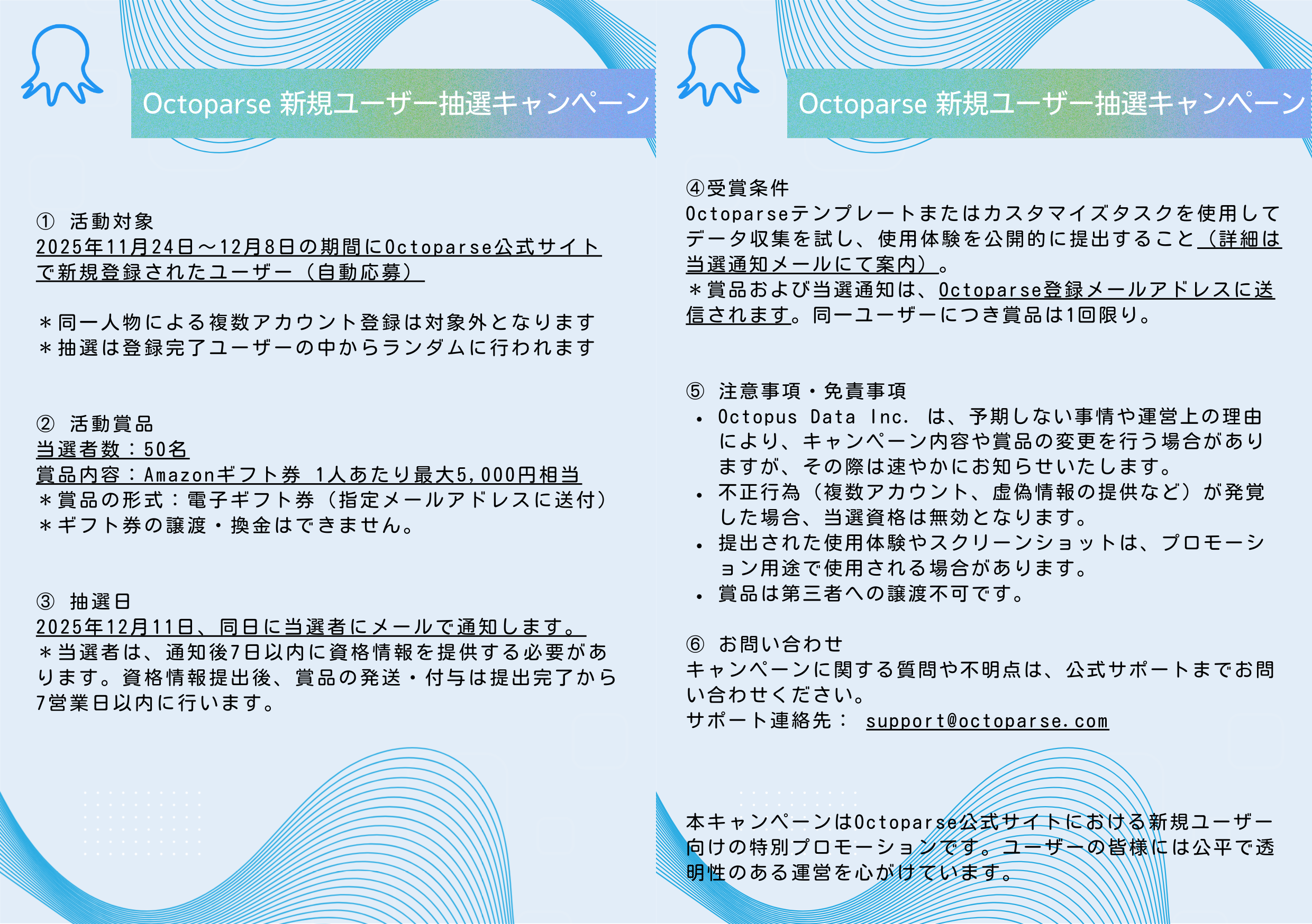 年末に向けて、Octoparse では 新規ユーザー・既存ユーザーのどちらも参加できる 3 大キャンペーンを同時開催しています。