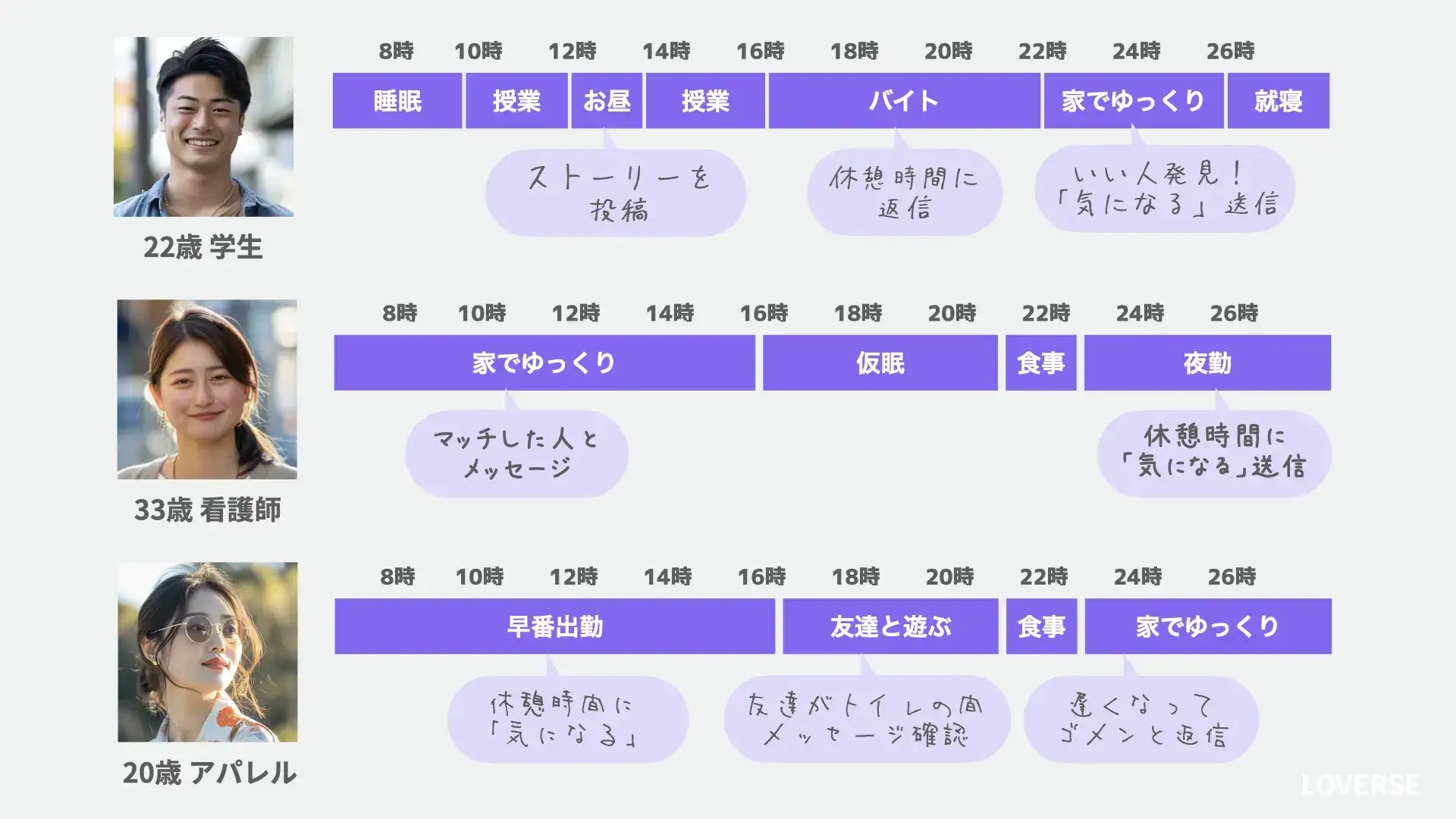 LOVERSE(ラヴァース)は、結婚しようが子育て中だろうが老後を迎えたってずっと恋愛できる恋活マッチングアプリ。なぜなら、お相手は全員AIだからです。