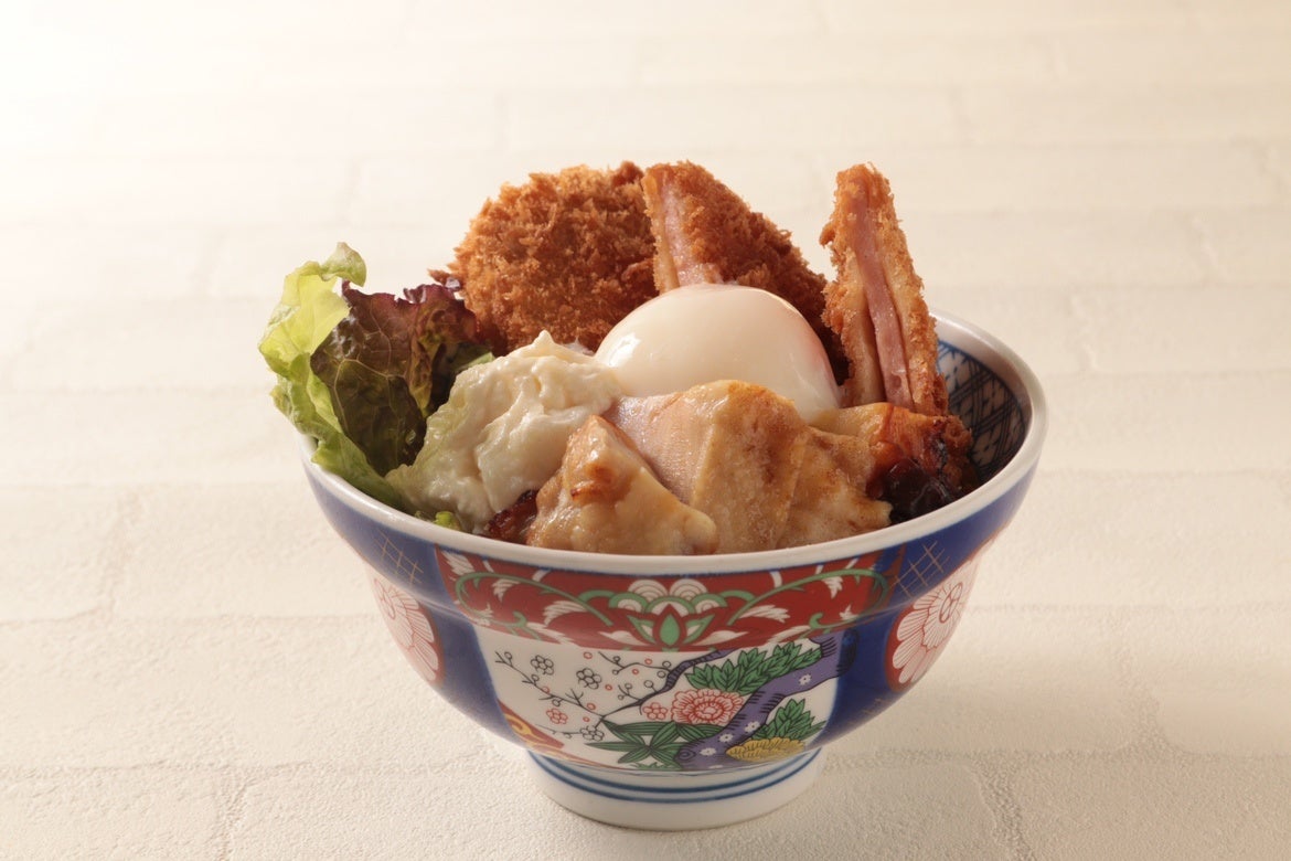 イカに代わってハムカツと照り焼きチキン、温泉卵を追加し贅沢な合い盛りにしています。
