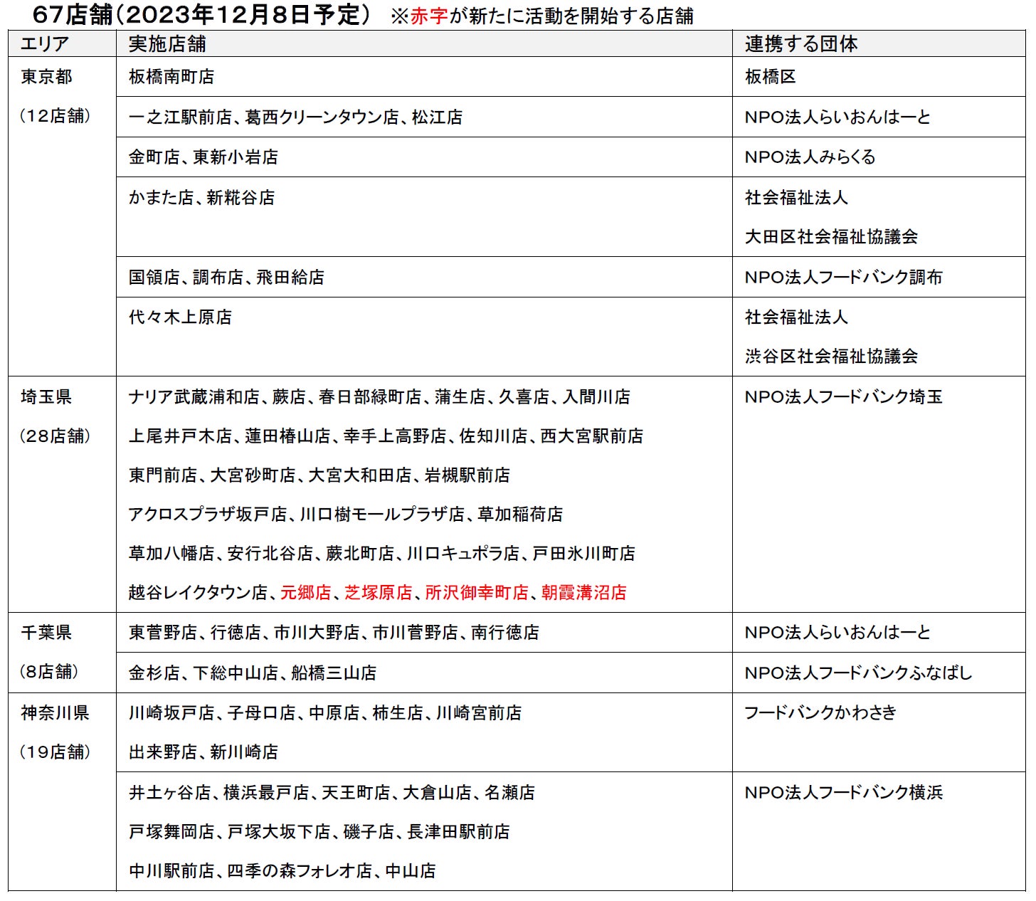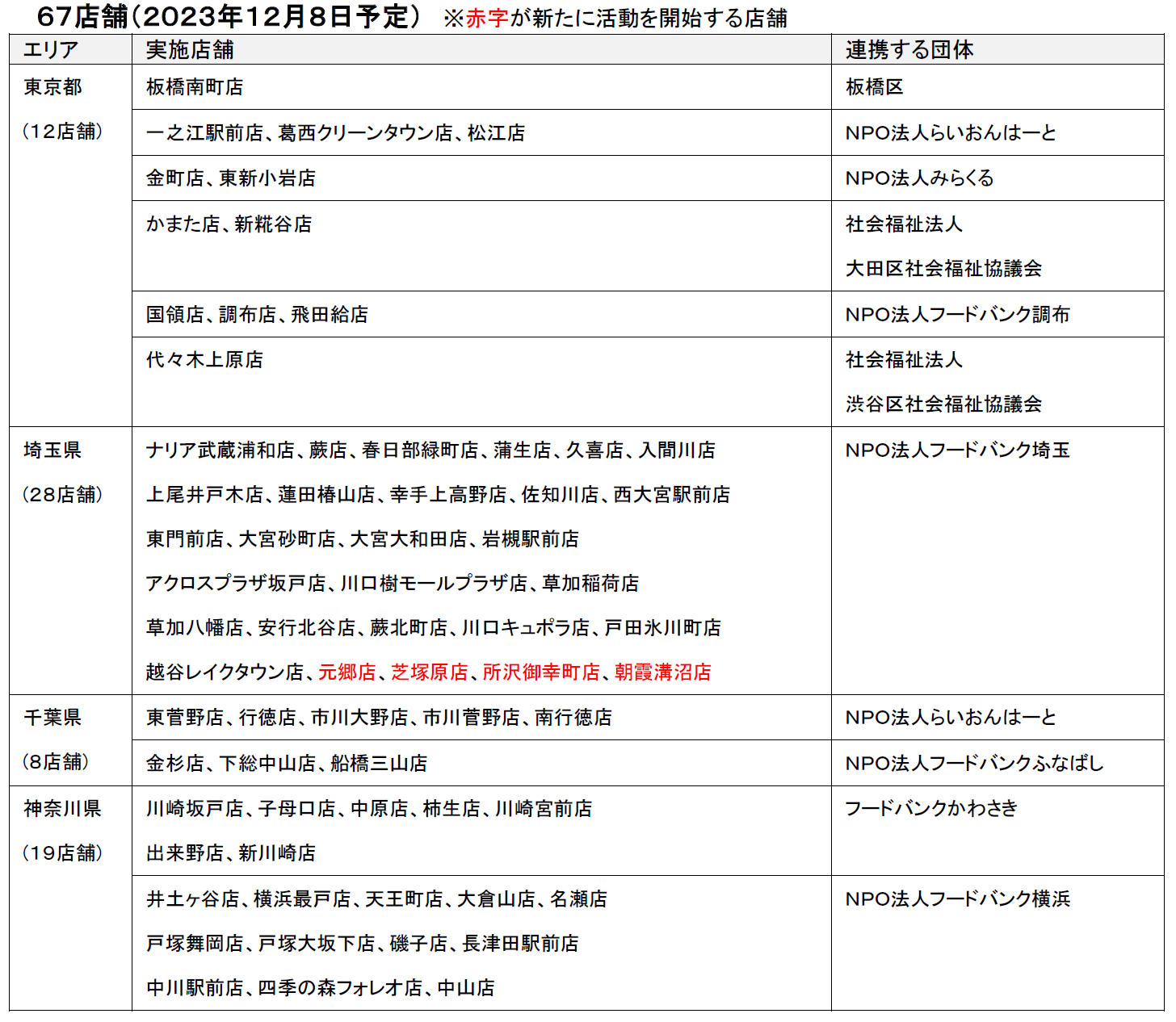 4店舗の拡大により、活動店舗は、東京都12店舗、埼玉県28店舗、千葉県8店舗、神奈川県19店舗の計67店舗(10団体との連携)となる予定です。