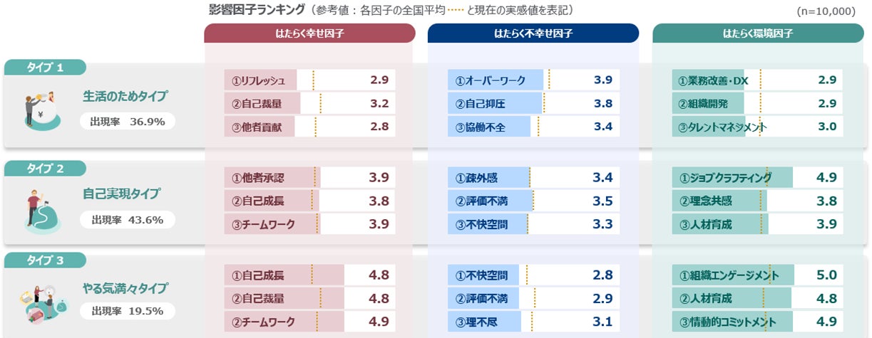 クラスター分析の結果、3つのタイプ(「生活のためタイプ」、「自己実現タイプ」および「やる気満々タイプ」)を生成しました。タイプごとに、スコア向上に「影響度が高い」と回答された因子のランキング(上位3つ)を示しています。例えば、出現率が最も高い「タイプ2 自己実現タイプ」では、はたらく幸せ因子における「他者承認」の実感向上、はたらく不幸せ因子における「疎外感」や「評価不満」の実感低減、などがスコア向上に影響する可能性が高い因子となっています。