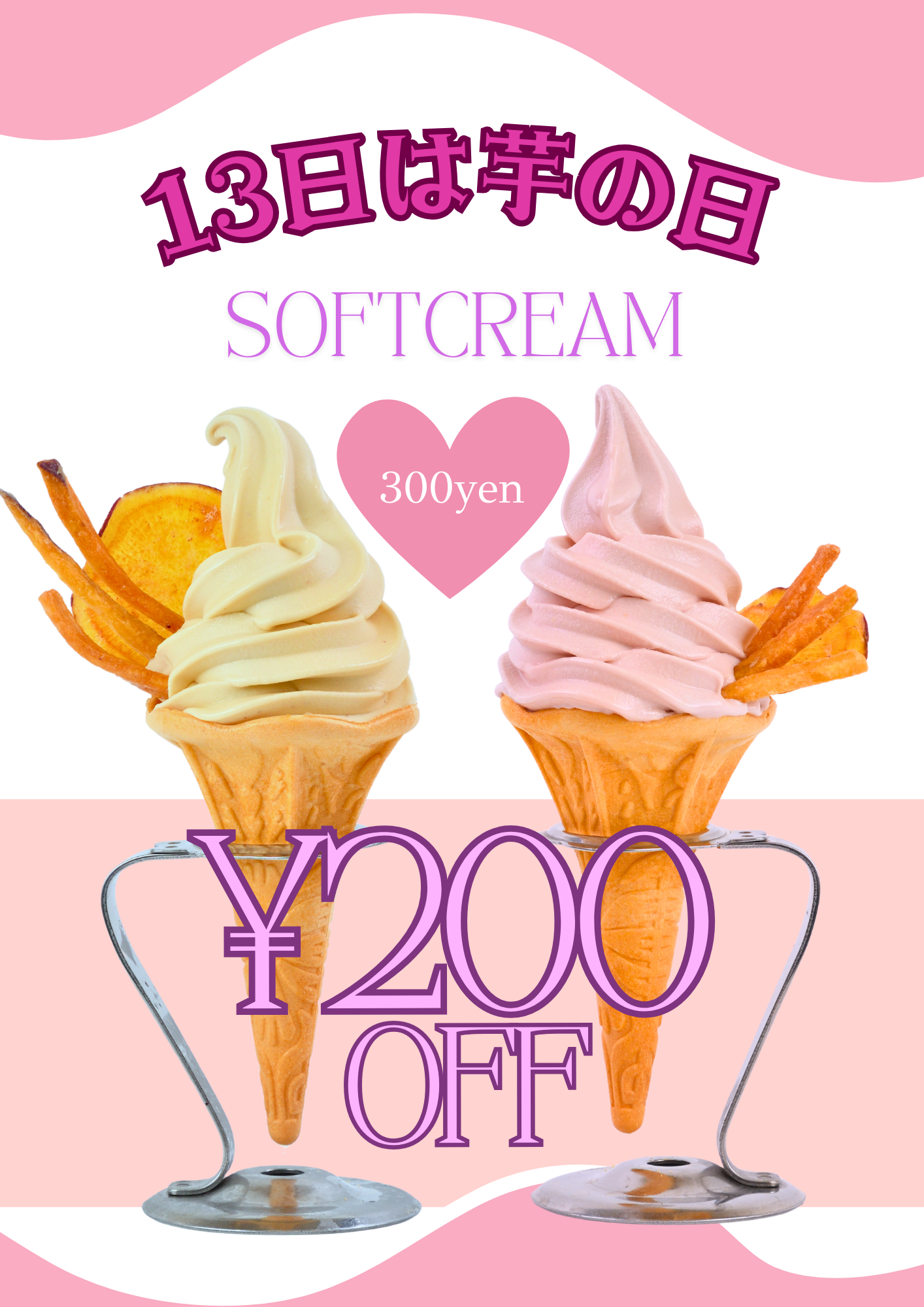 株式会社芋國屋(本社:千葉県流山市駒木)は、店舗運営する「芋國屋柏の葉店」において毎月13日は『芋の日』として、大人気のソフトクリームを200円引きの300円(税込)で販売致します。