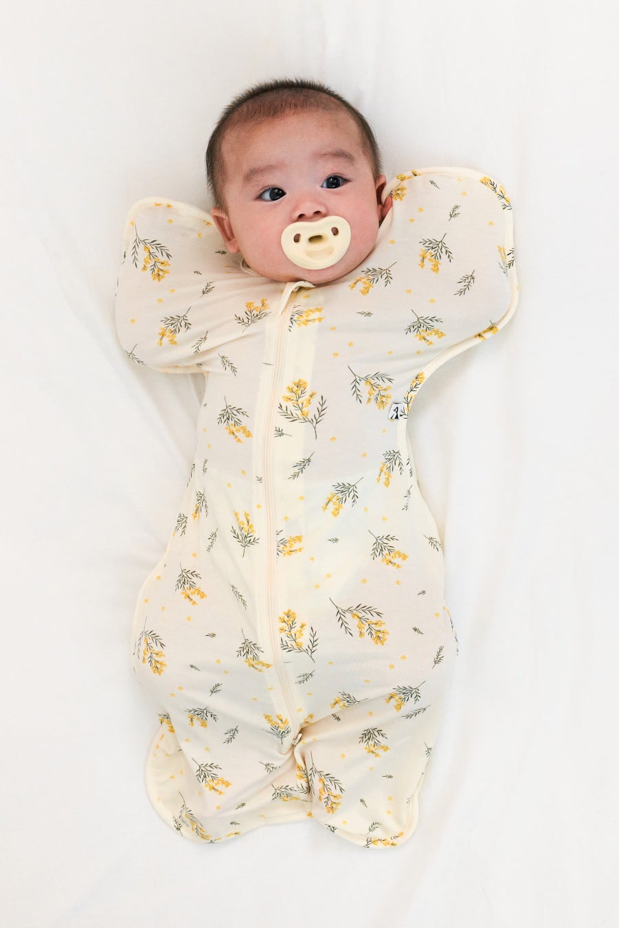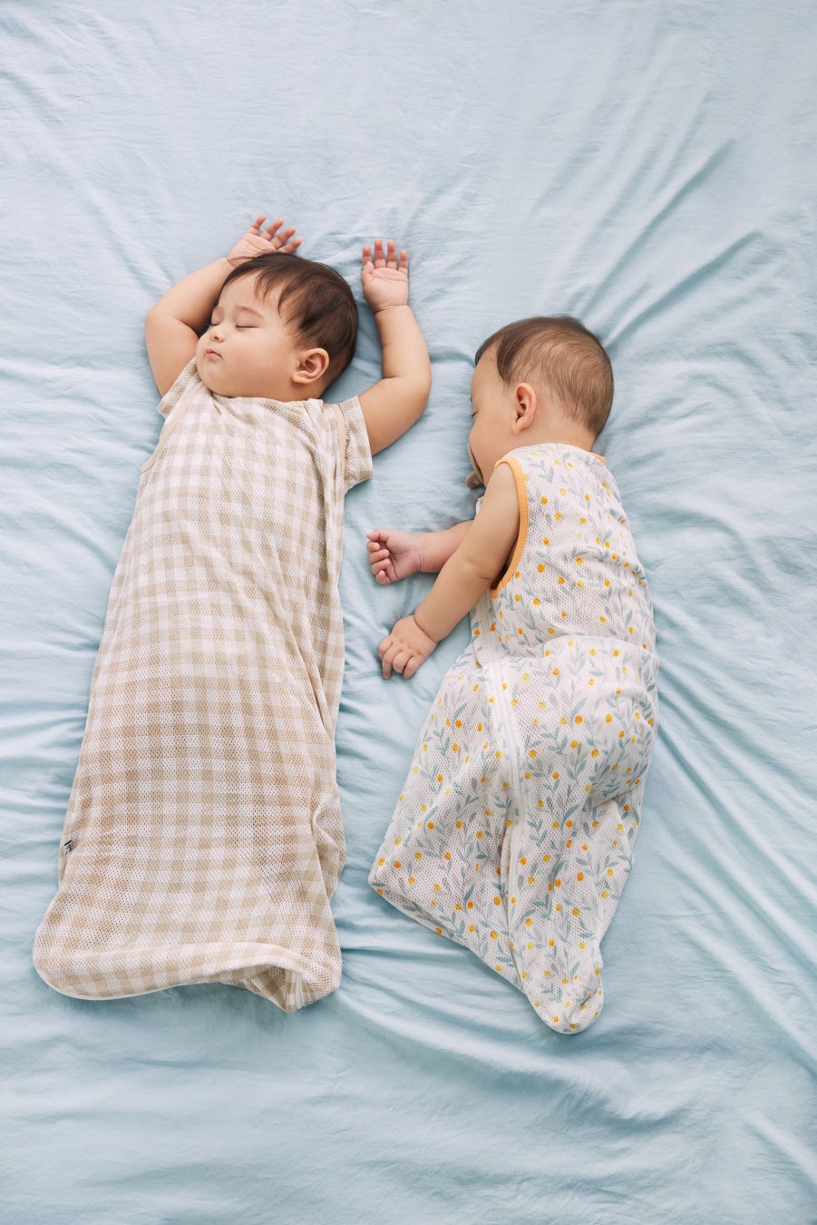 窒息防止のため、掛け布団や、布のスワドルの代わりにバンブースワドルポーチ(写真左)、モダールスワドルスーツ(写真右)の使用をオススメしています。これらを着せて寝かせることで、モロー反射でびっくりして起きてしまうことも防ぎます。