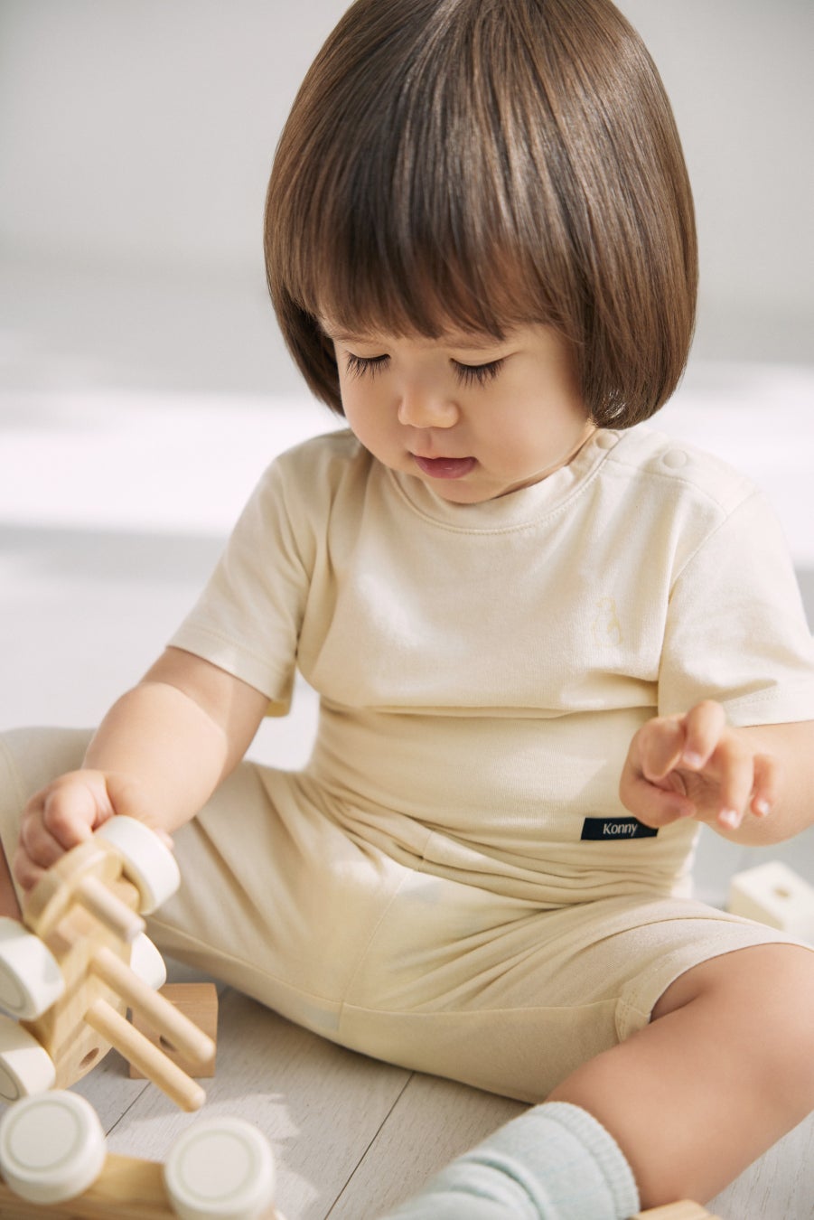 暑い夏、できるだけ心地よく過ごしてもらうために、ひんやり感のある綿混アイテムをラインナップしていきます。パジャマに加えて、通園着にぴったりなセットアップも登場。