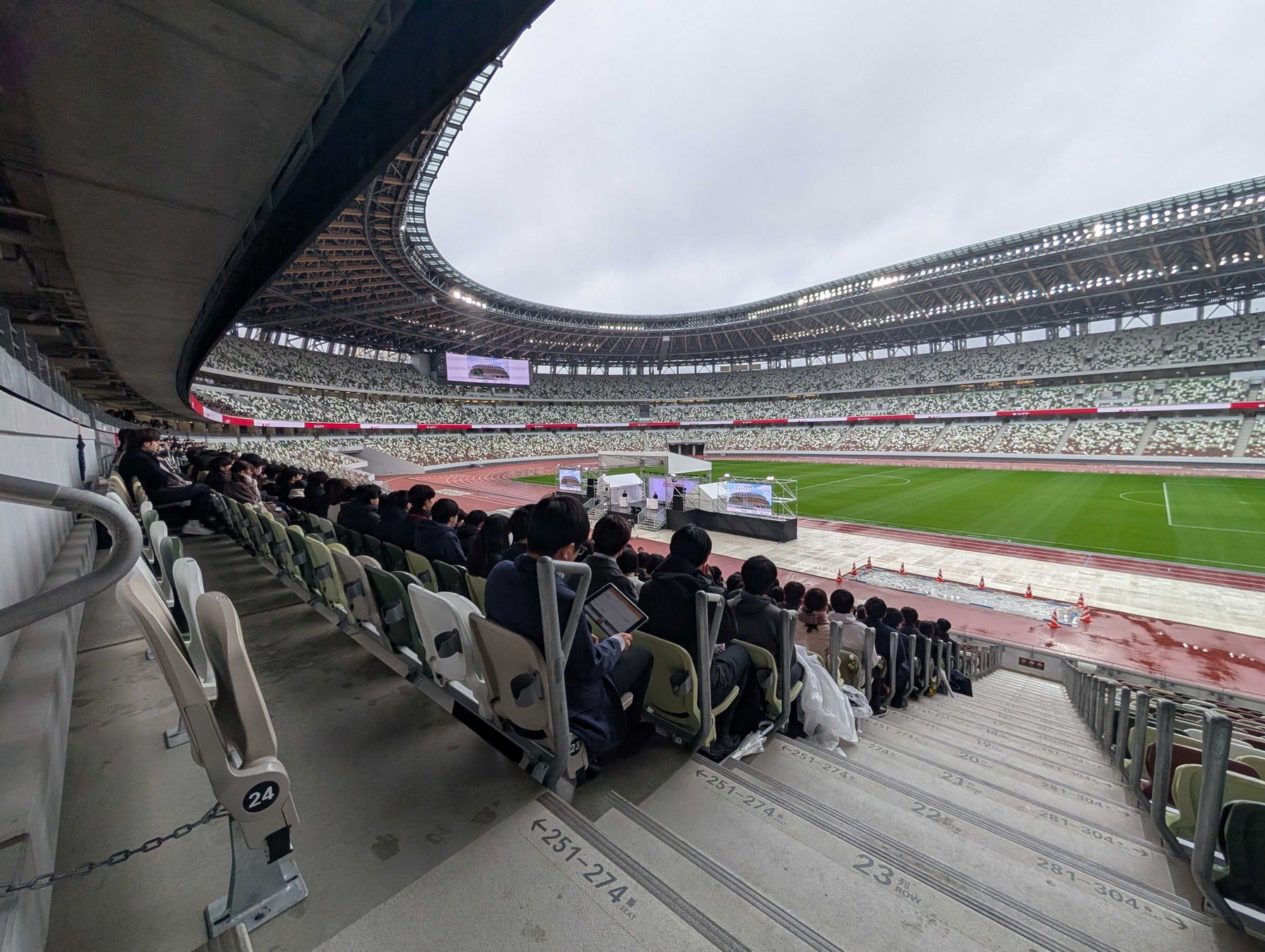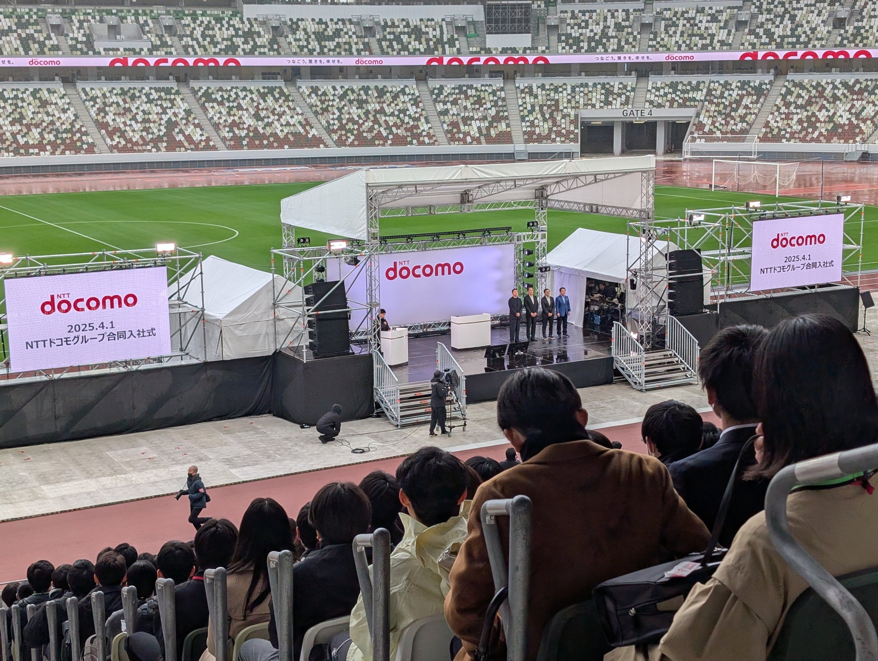 今回の入社式は、株式会社NTTドコモを含む4社で設立した株式会社ジャパンナショナルスタジアム・エンターテイメントが事業運営を行う「国立競技場」で開催されました。本イベントは2025年度の新卒入社社員だけでなく、コロナ禍で入社式がオンライン開催であった社員も対象としており、総勢約3,000人が参加する大規模イベントとなりました。