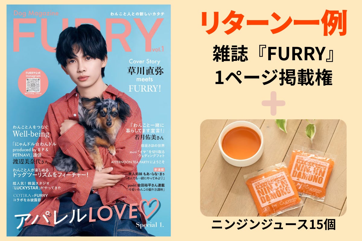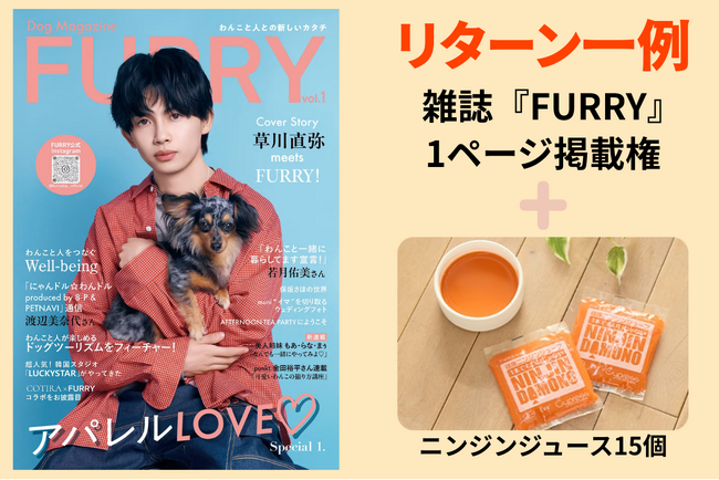 雑誌「FURRY」1ページ広告掲載権(ご希望のメッセージや写真で)、LPや公式サイトへの支援者名掲載など。