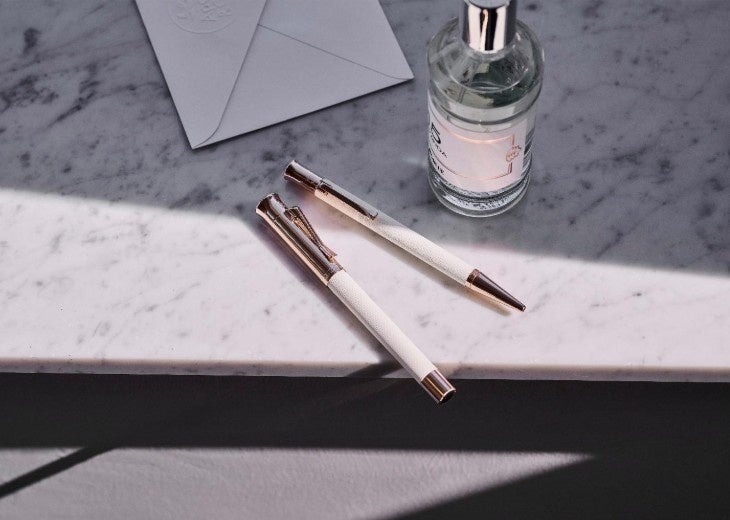新しく仲間入りした新色「シャンパンブラッシュ」は、ホワイトのバレル(胴軸)に、18金ローズゴールドのコーティングのメタルパーツを施し、上品で高級感のあるデザインに仕上げました。万年筆のペン先は18金を使用しており、滑らかで心地よい書き味をお楽しみいただけます。硬質な雰囲気が多い高級筆記具の中で女性も持ちやすい色の組み合わせです。