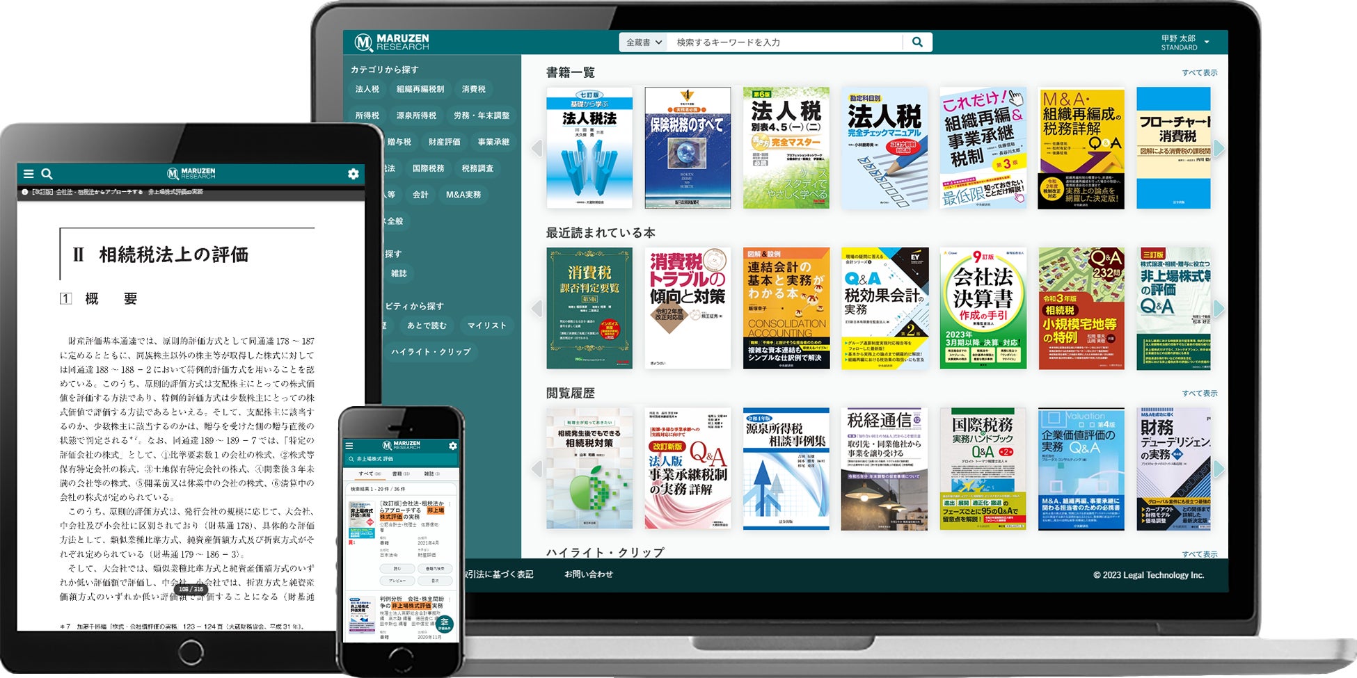 丸善リサーチは、会計・税務・M&A領域の専門書籍や雑誌をオンライン上で横断的に検索・閲覧できる定額制WEBサービスです。紙の出版物の信頼性・閲覧容易性とインターネットの迅速性を掛け合わせることで、知りたい情報に、いつでも、どこでも瞬時にアクセスでき、会計・税務専門家のリサーチ業務を圧倒的に効率化することができます。
