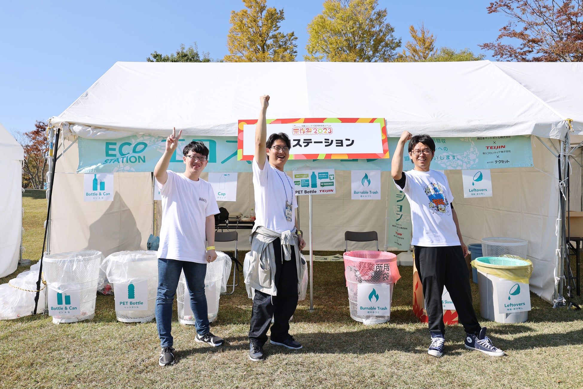 宗像フェスの会場は、ゴミの落ちてない「日本一マナーの良いフェス」と多くの関係者から評価を頂いています。その中でも、宗像フェスでは、2018年から帝人フロンティア株式会社と連携し、地域の学生の協力を得て大量に排出されるプラスチック容器を分別・洗浄して資源化を行っています。