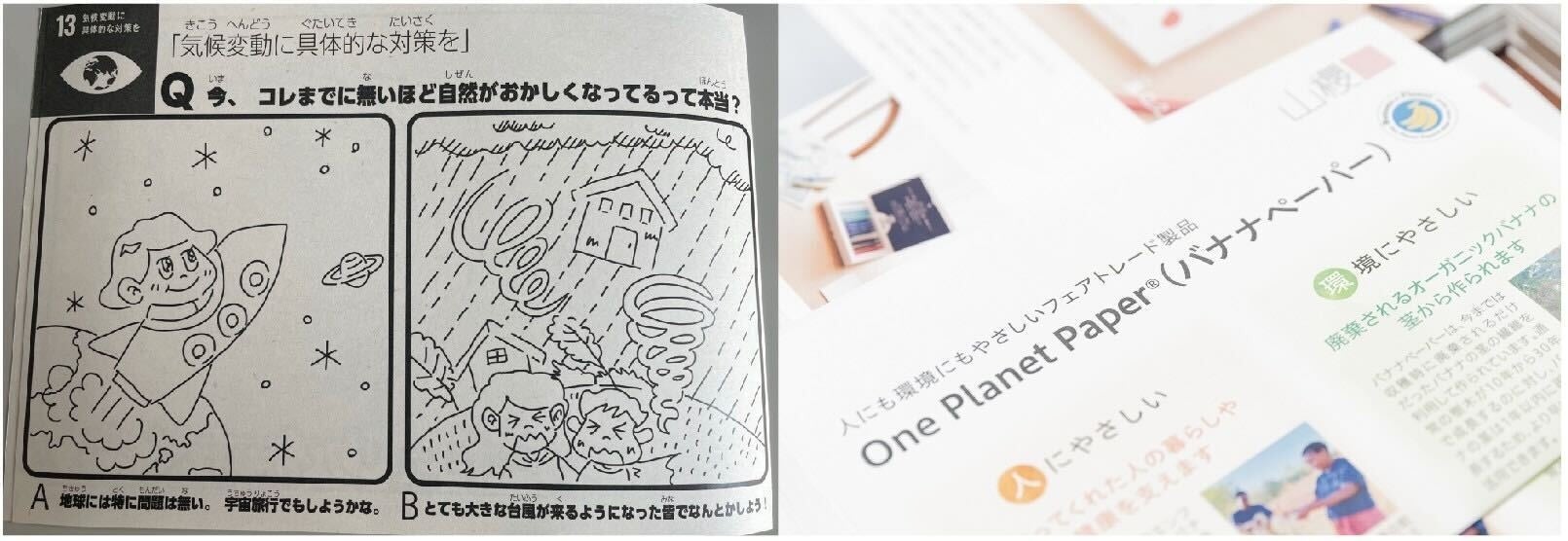 「地球温暖化クイズ」をバナナぺーパーで作成。SDGsクイズの塗り絵を来場者にプレゼント。クイズの答えが解ると、ママが5分のパラパラ読みでSDGsが理解できちゃう、SDGs1年生検定PDFデータを合わせてプレゼントしました。