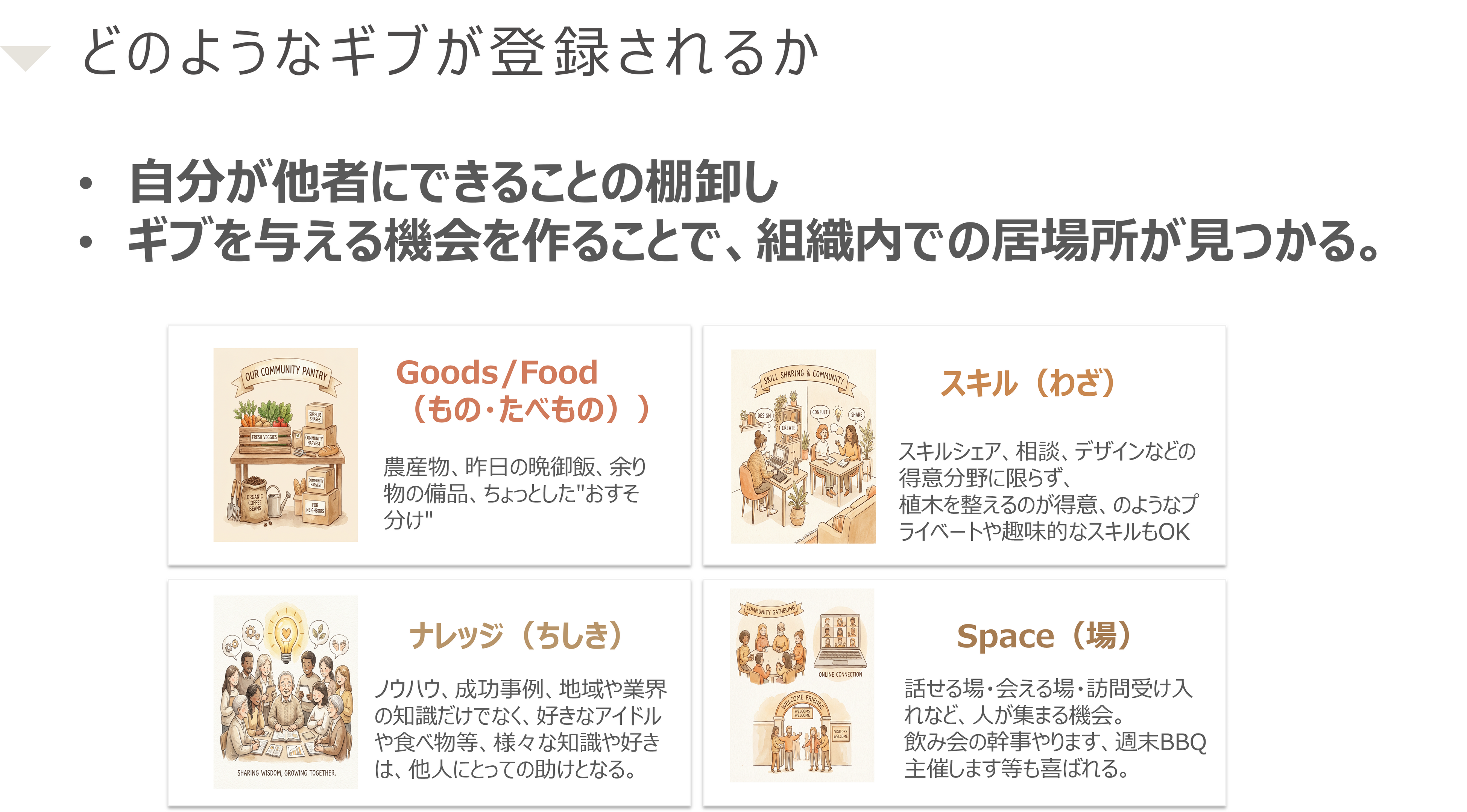 Goods/Food(物・たべもの):農産物、昨晩の晩ごはん、余った備品、“おすそ分け”など