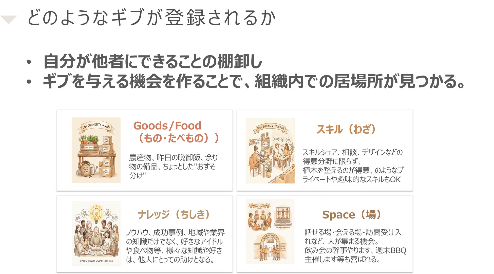 JICUの社内PoC(2025年8月〜10月)では、野菜のおすそ分け、イベント幹事、SNS/デザイン相談など多様なギブが登録・交換され、これまで交流したことがなかったメンバーとの交流が増加することや社内ランチが大幅に増加するなどの示唆が得られました。