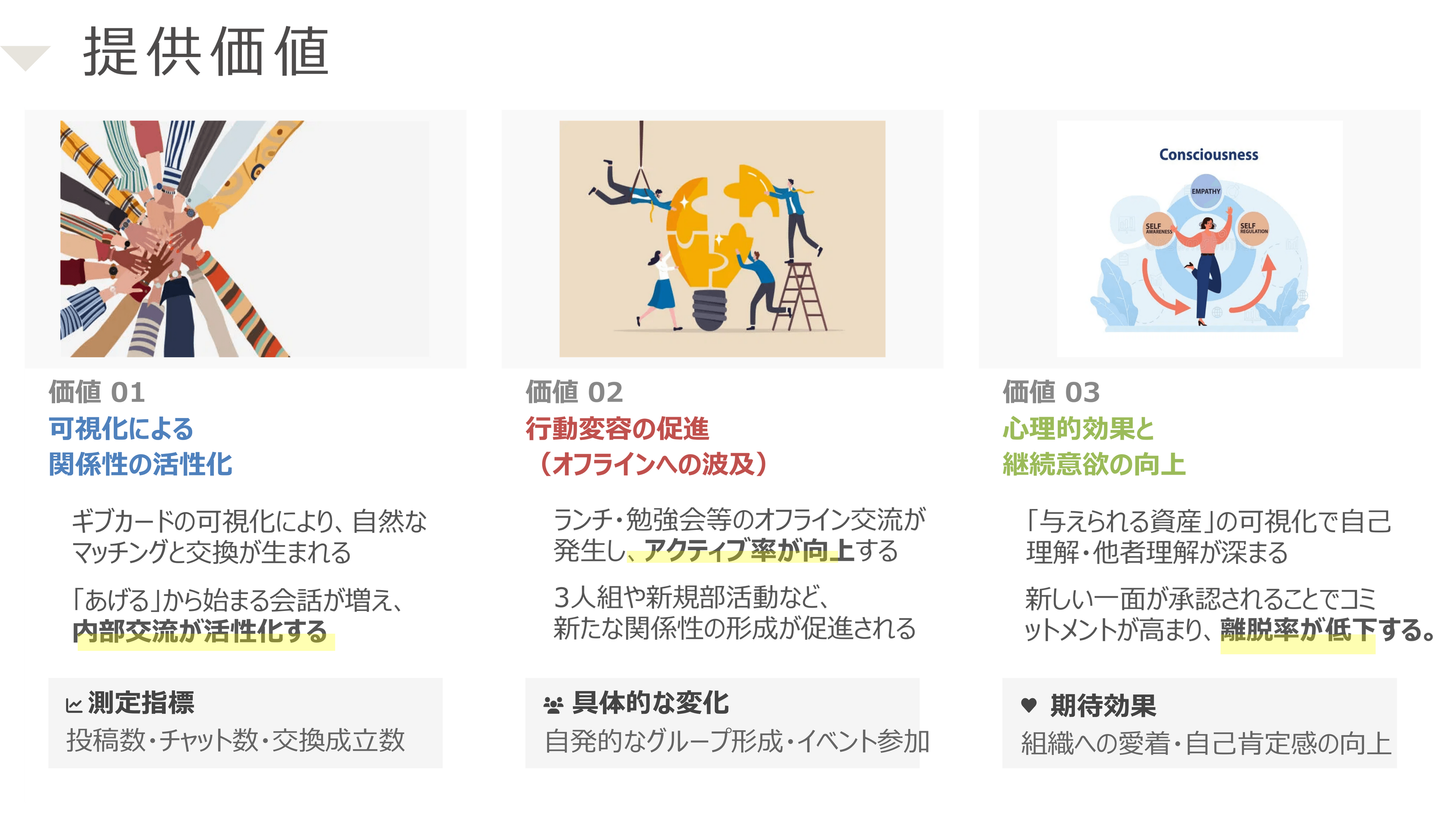 さらに、ギブを起点にした交流がランチ・勉強会などのオフラインへ波及し、自発的なグループ形成・イベント参加などの行動変容を促します。