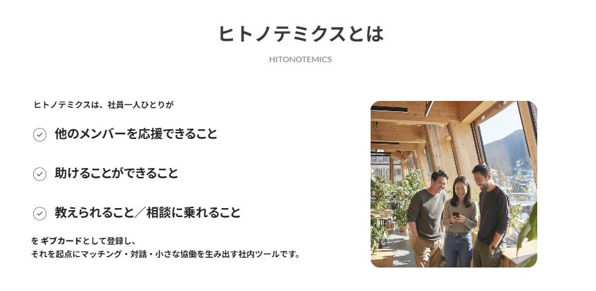 ヒトノテミクスは、自分が提供できる“ギブ”を登録し、組織内で共有できるスマホアプリです。