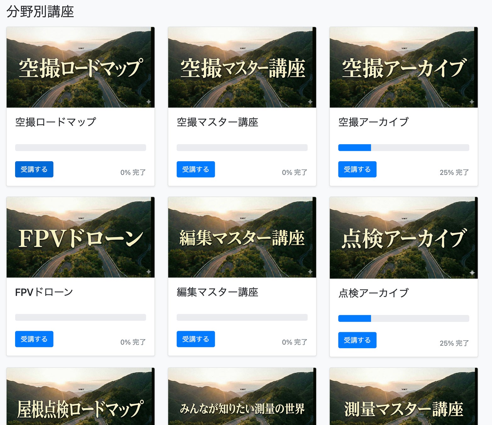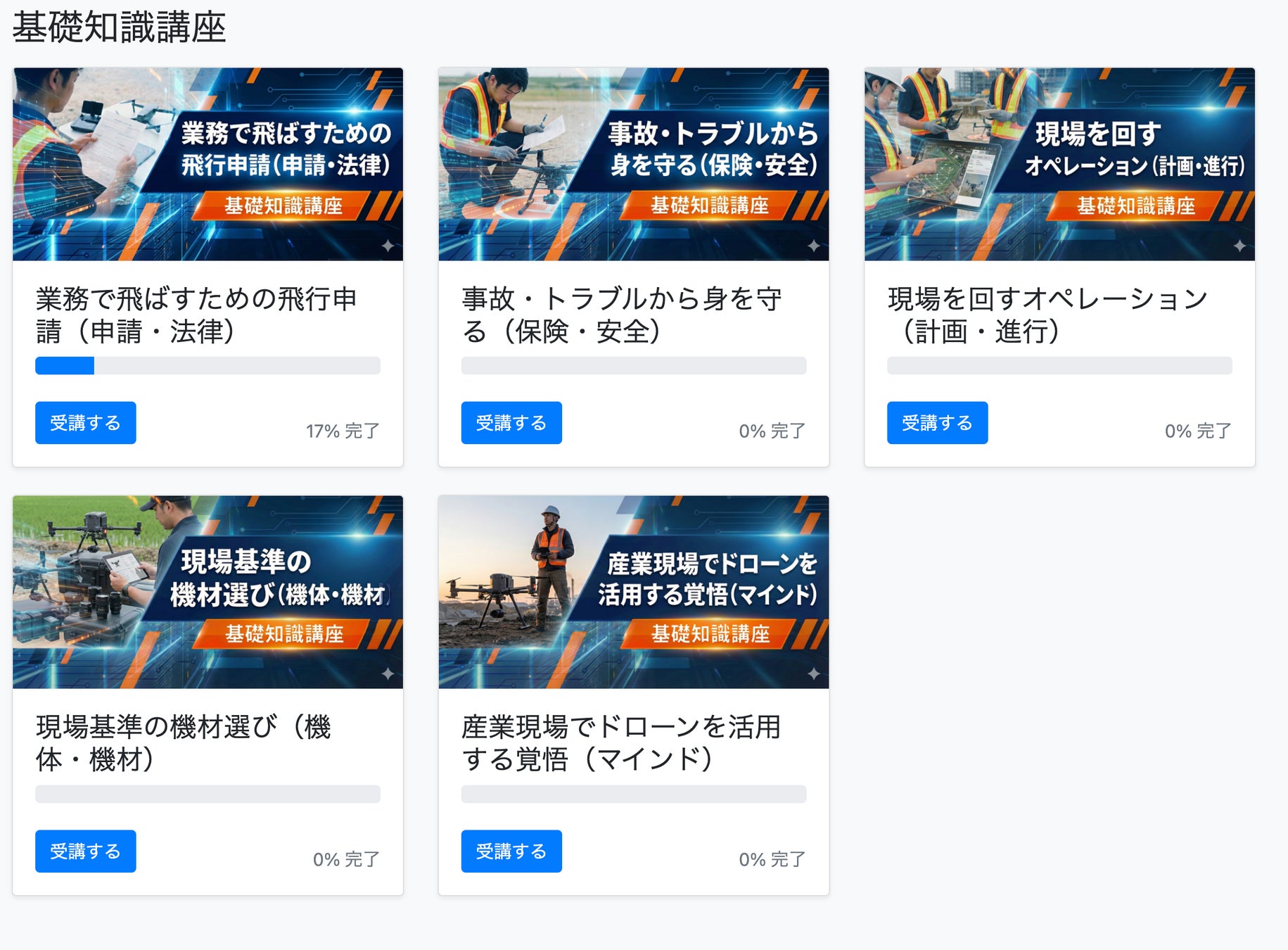 ドロビジでは、ドローンビジネスの基礎から実践的なノウハウまで、体系的に学べる動画コンテンツ「ドロビジアカデミー」を提供しています。合計70本以上/60時間以上の有益動画コンテンツをいつでも視聴可能で自分のペースで繰り返し視聴できます。