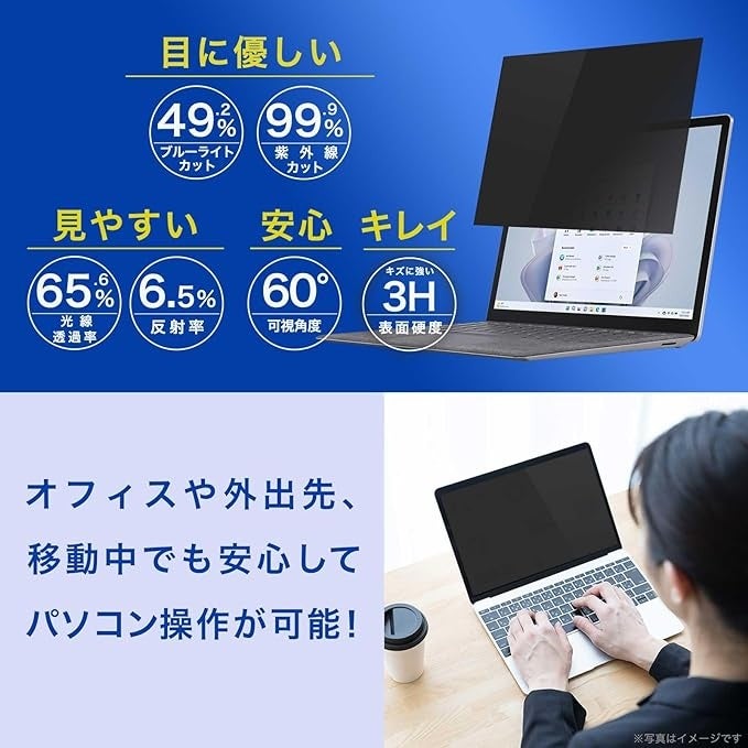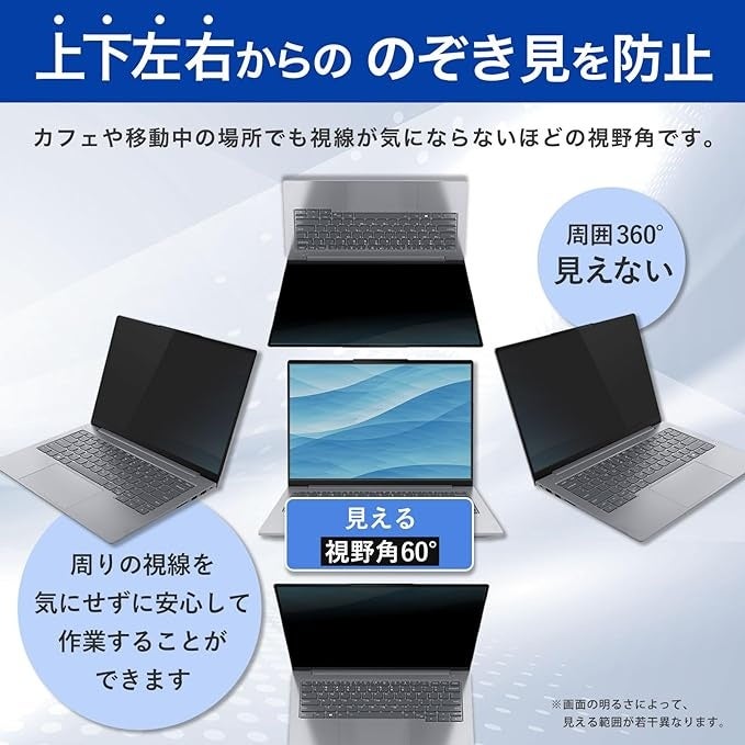 画面の正面を中心に上下左右で60°より外の角度からはモニターの画面が真っ黒に見えますので、プライバシーが守られる覗き見防止フィルターです。