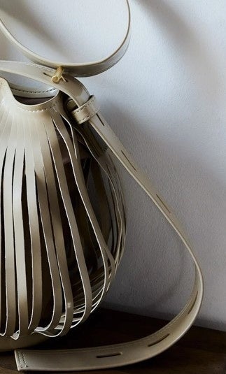 バッグのラインは、水のかたちと動きにインスパイアされたオーガニックなフォルムが特徴。プリーツや繕いから生まれたこのバッグシリーズは、日本の「襤褸(ぼろ)」といった技術を応用し、使い込まれたものに美しさを加えるという精神を体現しています。