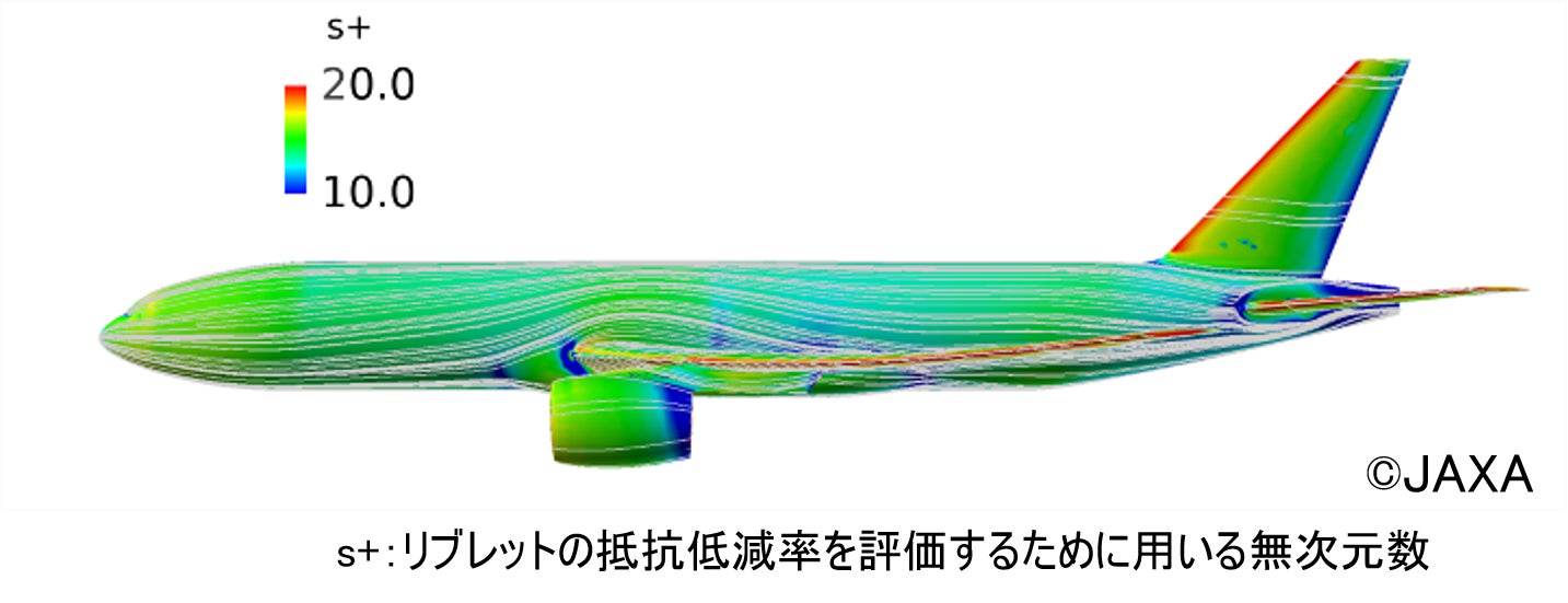 (*5)機体にリブレットを施工した際の空気抵抗低減効果推算技術の例。s+はリブレットの抵抗低減率を評価するために用いる無次元数で、一般的にs+が15~17付近でリブレットの抵抗低減率が最大となる。リブレットの溝方向と表面流線方向の角度の影響も考慮して推算。