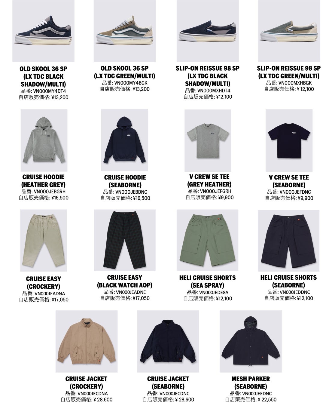 VANS公式オンラインストアをはじめ、VANS STORE HARAJUKU、BEAMS JAPAN SHINJUKU、BEAMS公式オンラインショップ、BILLY’S 各店、BILLY’S ENT 公式オンランストアなどで展開されます。