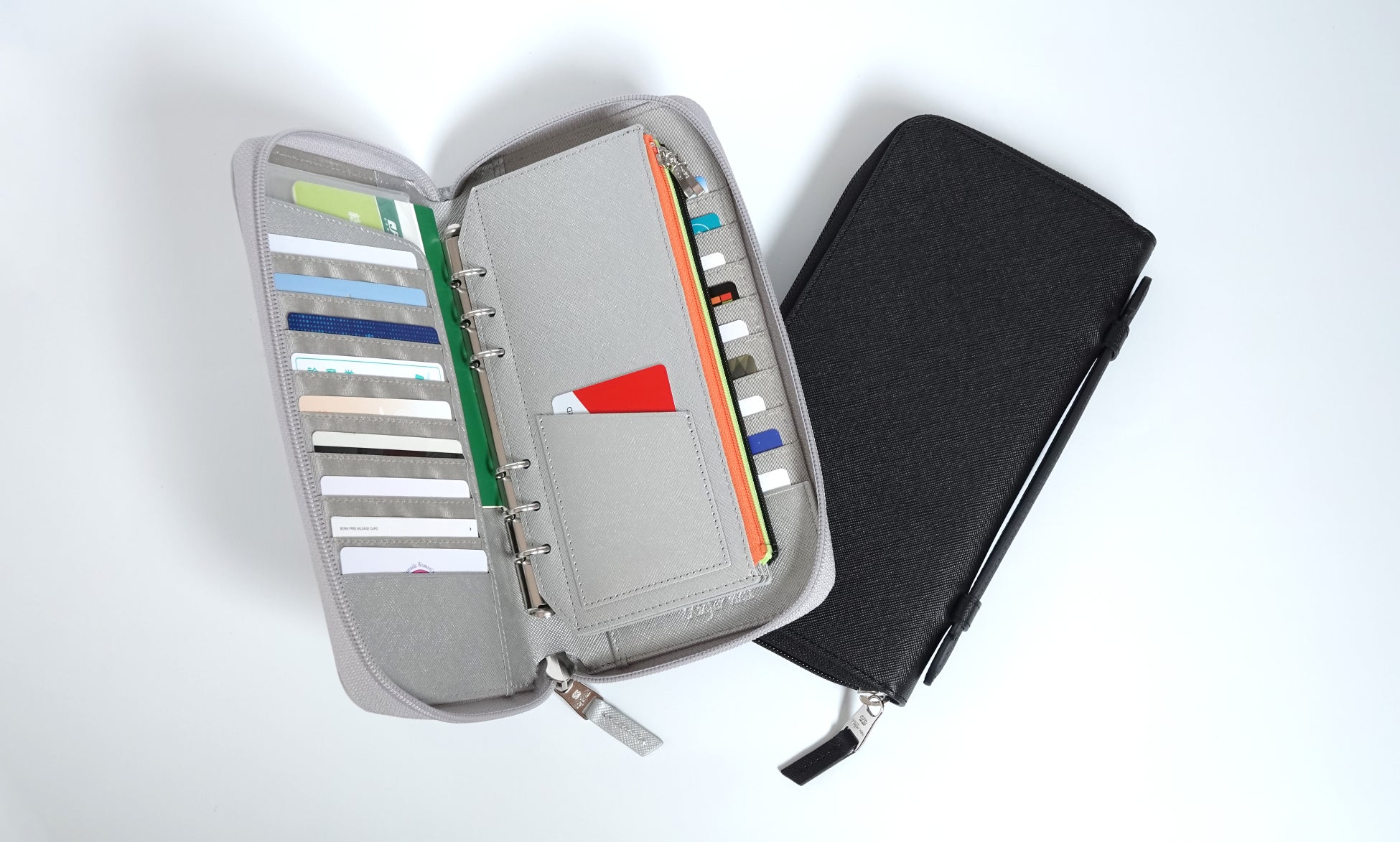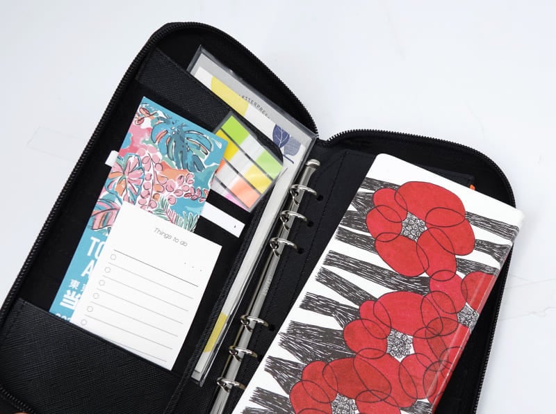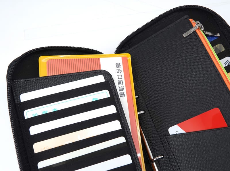 付属リフィルは3枚。ポイントカードが入るポケット付きなので、食費と生活費に分けてそれぞれよく利用するショップカードをセットしたり、予備費の財布としてクレジットカードを入れて家計管理をするなど、アイデアで多様な使い方ができます。