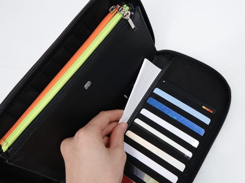 左右両側にそれぞれ9枚ずつ入るカードポケットを備えています。左のカードポケットの裏側には、通帳や金券などが差し込みやすいL字ポケットをつくりました。