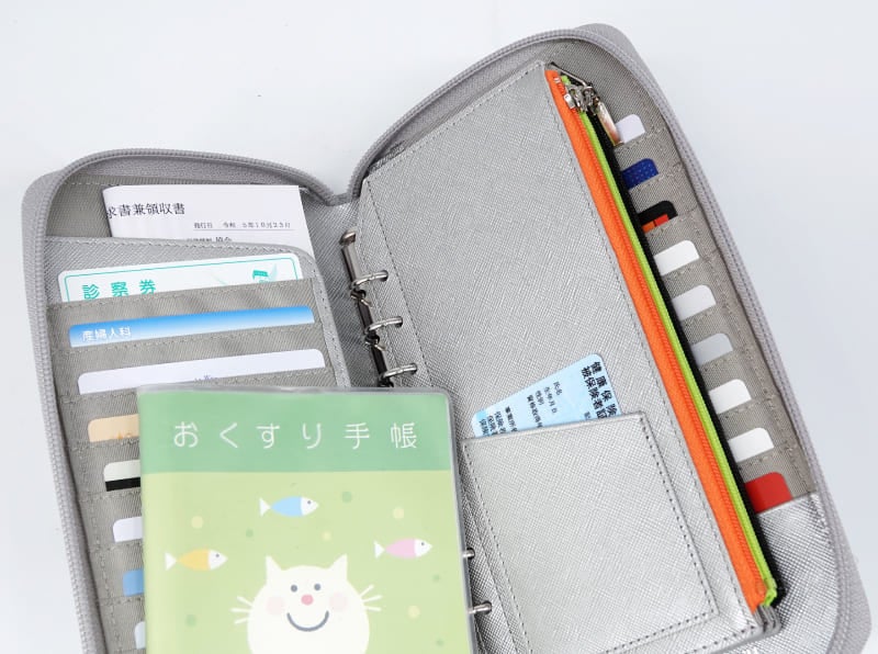 かさばりがちな診察券とお薬手帳がまとめて収納できます。リフィルには現金と保険証、常備薬や絆創膏などを入れておくとさらに便利。通院時にもらう診療明細や調剤明細は縦に折って左のL字ポケットへ。