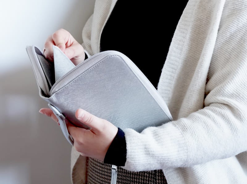 安定して持ちやすいプルアップハンドル付きだから、左手をハンドルに差し込んだまま右手でリフィルの中身やカードの出し入れができます。一般的な財布と同じようにストレスなく使用できるのも魅力です。