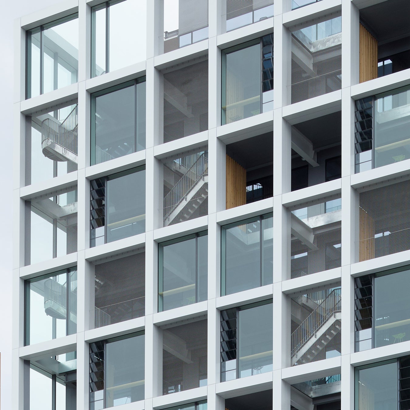 特徴的な外観を生み出す半外部のテラスは、内部への日射の直達を遮蔽し、Low-Eガラスとの組み合わせにより、空調負荷を大幅に削減しました。また、テラスには利用者の手で開閉が可能なジャロジー窓を設置し、風通しの良い空間をつくりながら、事務室の自然換気を促すパッシブデザインを行っています。