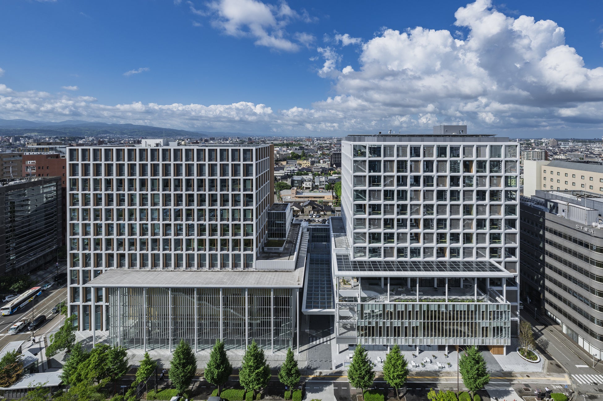 「Hirooka Terrace」に隣接して建つ北國銀行本店ビル。金沢の歴史や風土を継承し、地域に親しまれる「まちの広間」を目指し、北陸の自然環境を踏まえた採光・換気や井戸水の積極的な利用により熱負荷の低減を図りました。県産のスギを用いたインテリアや輪島塗のベンチ、二俣和紙を用いたサインなど「地産地消」にこだわり、地域の素材を身近に感じられる建物となっています。2016年に、第27回北陸建築文化賞作品賞を受賞しました。「Hirooka Terrace」竣工後も、一体的な利用を可能とするリノベーションが行われています。