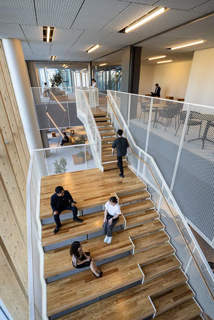 オフィス北面(けやき大通り側)に配置されたテラスは、水平方向に加えて階段や吹き抜けを介して上下方向にも連続。テナントごとの専有区画とせず、全テナントが自由に活用できる大らかな共用空間です。一般的なオフィスビルでは、テナント同士の出会いや交流は内部廊下でのみ生じることとなりますが、本建物では、この半外部のテラスによって窓の外側の空間も「表」とし、建物内外で賑わいを生み出す構成としています。