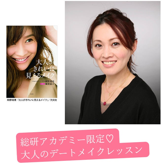 追加コンテンツの中でも特に注目なのが、女優やタレントから絶大な支持&指名を受ける、品よく女性らしいメイクが大人気のカリスマヘアメイク・岡野瑞恵さんによる動画レッスン【大人のデートメイク】。「特別にきれいなひと」になれてしまう魔法と技術が詰め込まれている動画レッスンは「総研アカデミー」限定講座となっています。