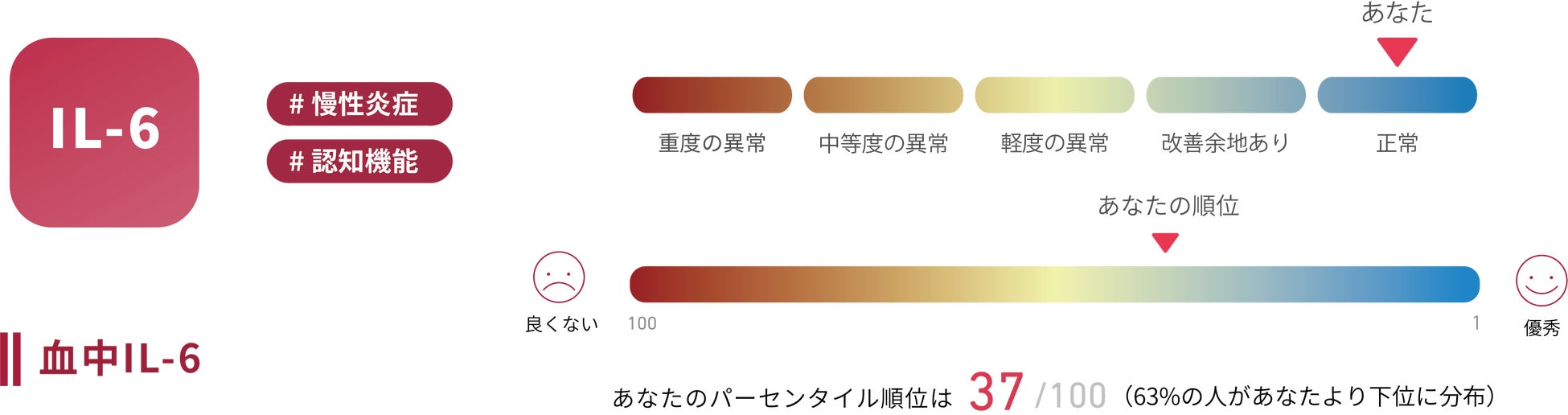 生物学的な老化と関連する可能性がある、生活習慣に関する指標や血液中のタンパク質の指標について、エピジェネティクスに基づく評価結果を把握できます。