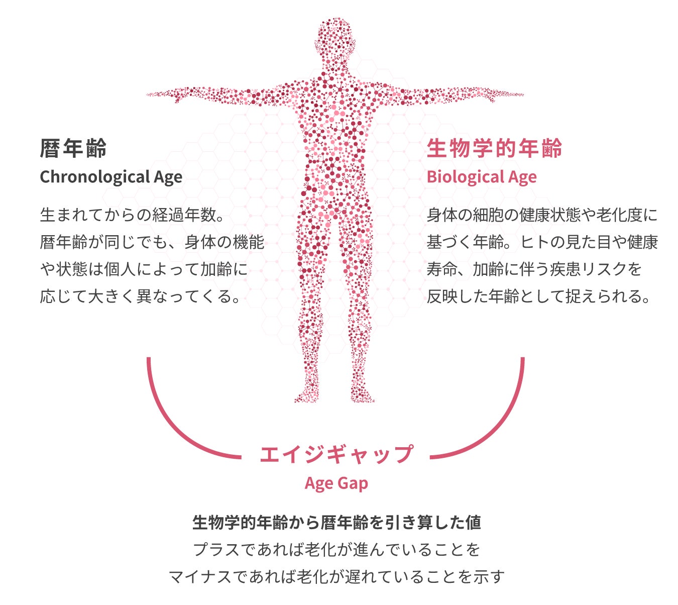 エピクロック®テストは、世界でスタンダードとなりつつある、エピジェネティクスの情報から身体の老化具合や老化の進行速度を「見える化」する次世代の生物学的年齢検査です。生物学的年齢は「暦年齢(誕生からの経過年数)」と異なり、見た目の若々しさや健康寿命、加齢に伴う疾患リスクを反映した年齢として捉えられています。