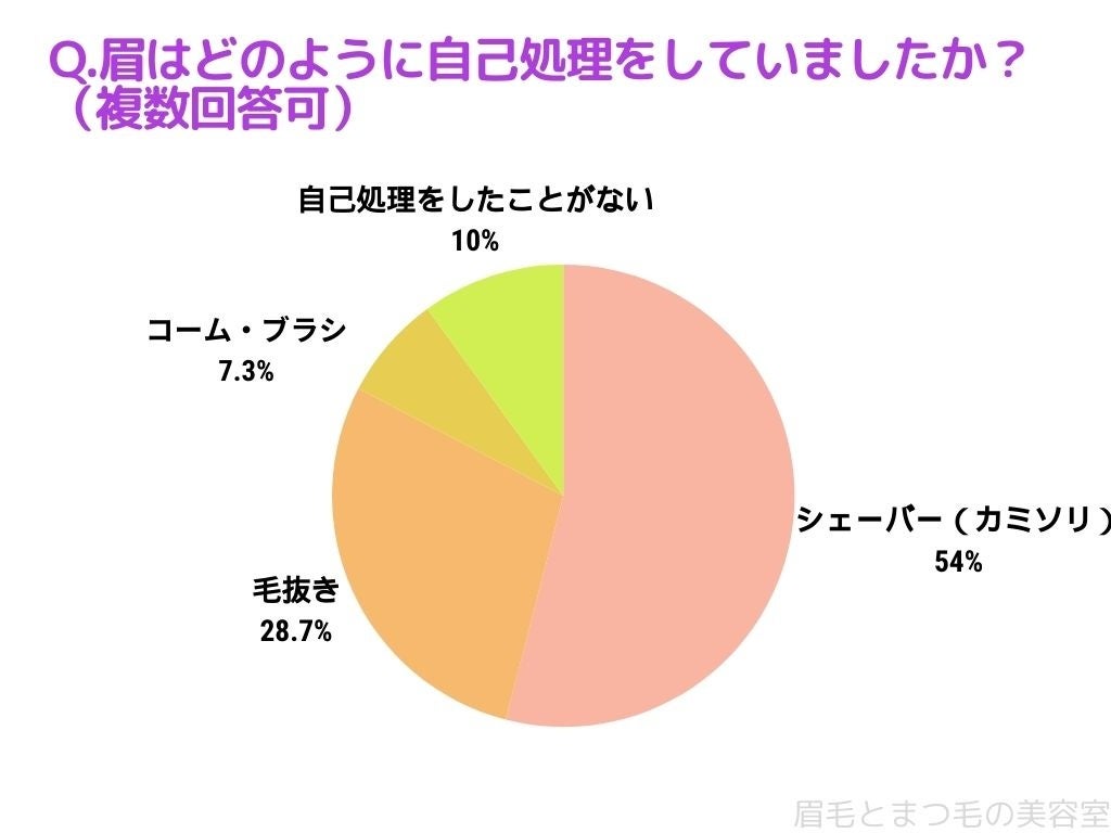 自己処理の仕方をお聞きしたところ「シェーバー[カミソリ](54%)」、「毛抜き(28.7%)」、「コーム・ブラシ(7.3%)」、「自己処理をしたことがない(10%)」という結果になりました。