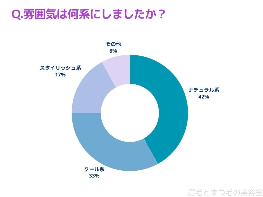 眉毛サロンで何系の眉にしたかお聞きしたところ「ナチュラル系(42%)」、「クール系(33%)」、「スタイリッシュ系(17%)」という結果になりました。