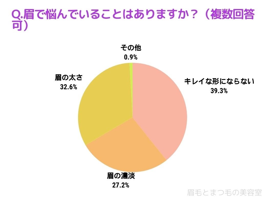眉の形について悩む人が多くいるということから、多くの人が自己処理で悩みを抱えているようです。また、眉の濃淡や太さなど、生まれもった眉について悩む人が多くいました。