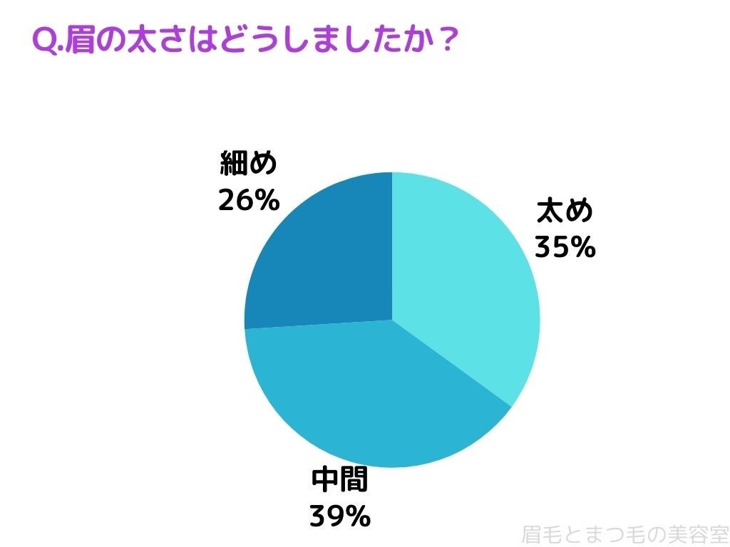 眉毛サロンで眉の太さをどう施術したかお聞きしたところ「太め(35%)」、「中間(39%)」、「細め(26%)」という結果になりました。