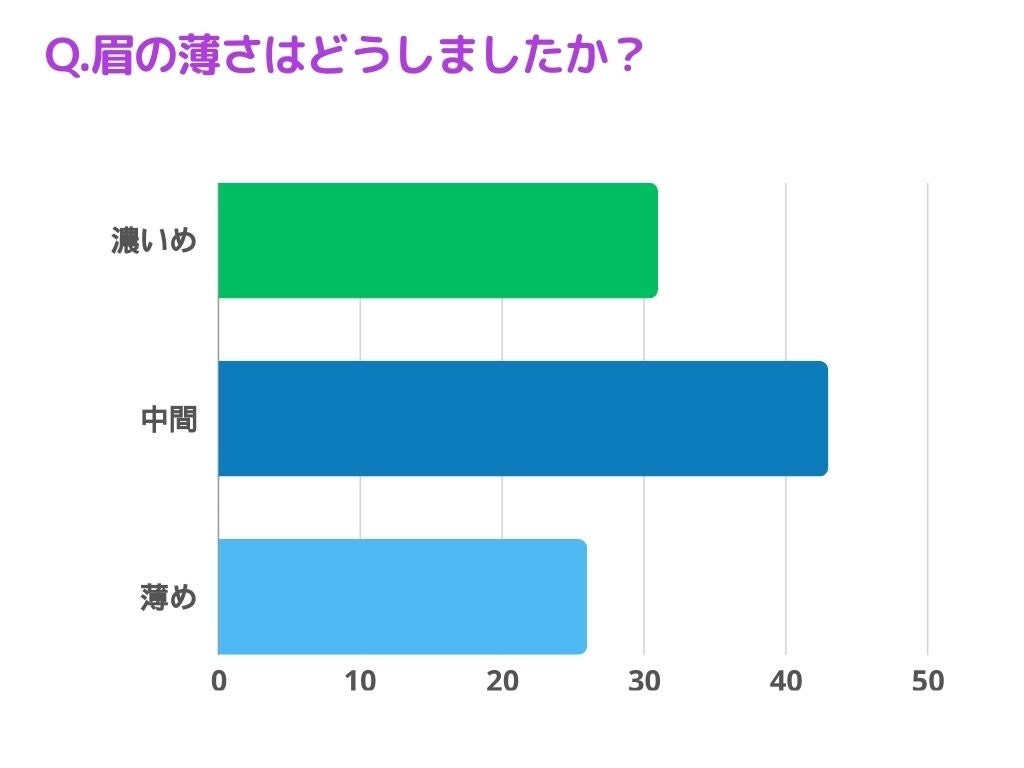 1番人気は、細め・太めどちらにも寄らない中間の太さということが分かりました。太めの方がやや人気という結果から、存在感のある眉が好みという人が多いと推測できます。