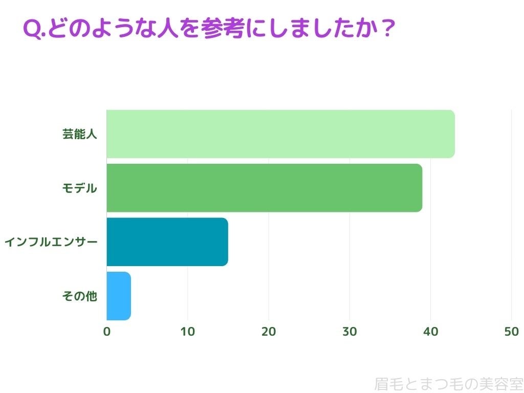 どのような人を参考にしたかお聞きしたところ「芸能人(43%)」、「モデル(39%)」、「インフルエンサー(15%)」、「その他(3%)」ということが分かりました。