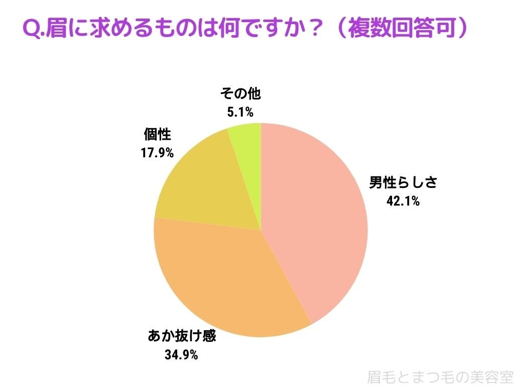 眉に求めるものは「男性らしさ(42.1%)」、「あか抜け感(34.9%)」、「個性(17.9%)」、「その他(5.1%)」ということが分かりました。