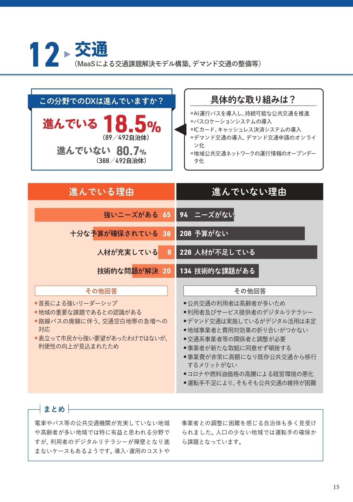 一方で、進んでいない自治体は80.7%に上り、公共交通の利用者が主に高齢者であり、サービス提供者と利用者のデジタルリテラシーの不足、デマンド交通の導入はあるもののデジタル化には未定、地域事業者との費用対効果の折り合いがつかない、事業者との調整に困難を感じるなどの理由が挙げられています。