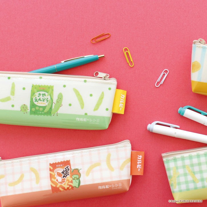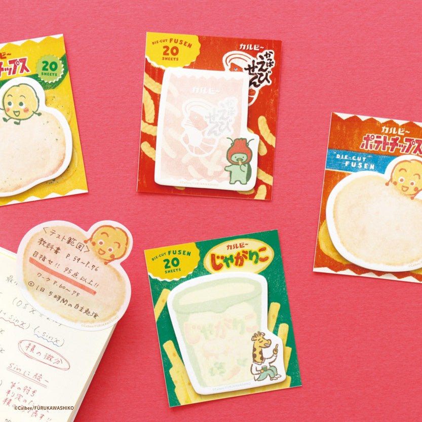 カルビーの実在するお菓子の「ポテトチップス」、「じゃがりこ」、「かっぱえびせん」、「さやえんどう」を古川紙工のデザイナーがほっこりレトロなタッチで描き起こした『カルビーレトロ』シリーズです。子どもから大人まで全世代が楽しめる文具雑貨となっています。