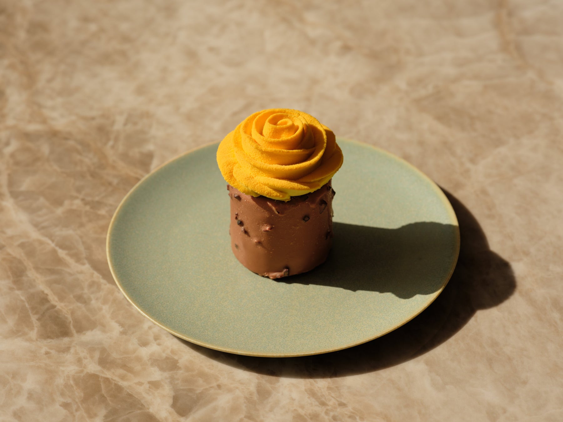 今回の新作では、天然ベルガモットにこだわった沖縄ティーファクトリーのアールグレイと、たっぷりのオレンジを使用。土台にはオレンジのビスキュイとミルクチョコクランチを重ね、中央にはとろりとしたオレンジジュレとアールグレイブリュレをしのばせました。全体をやさしい甘さのアールグレイ風味のチョコレートムースで包み、外側はミルクチョコレートでコーティング。オレンジムースを囲む薔薇の花びらは、オレンジガナッシュでパティシエがひとつひとつ手絞りで丁寧に仕上げました。