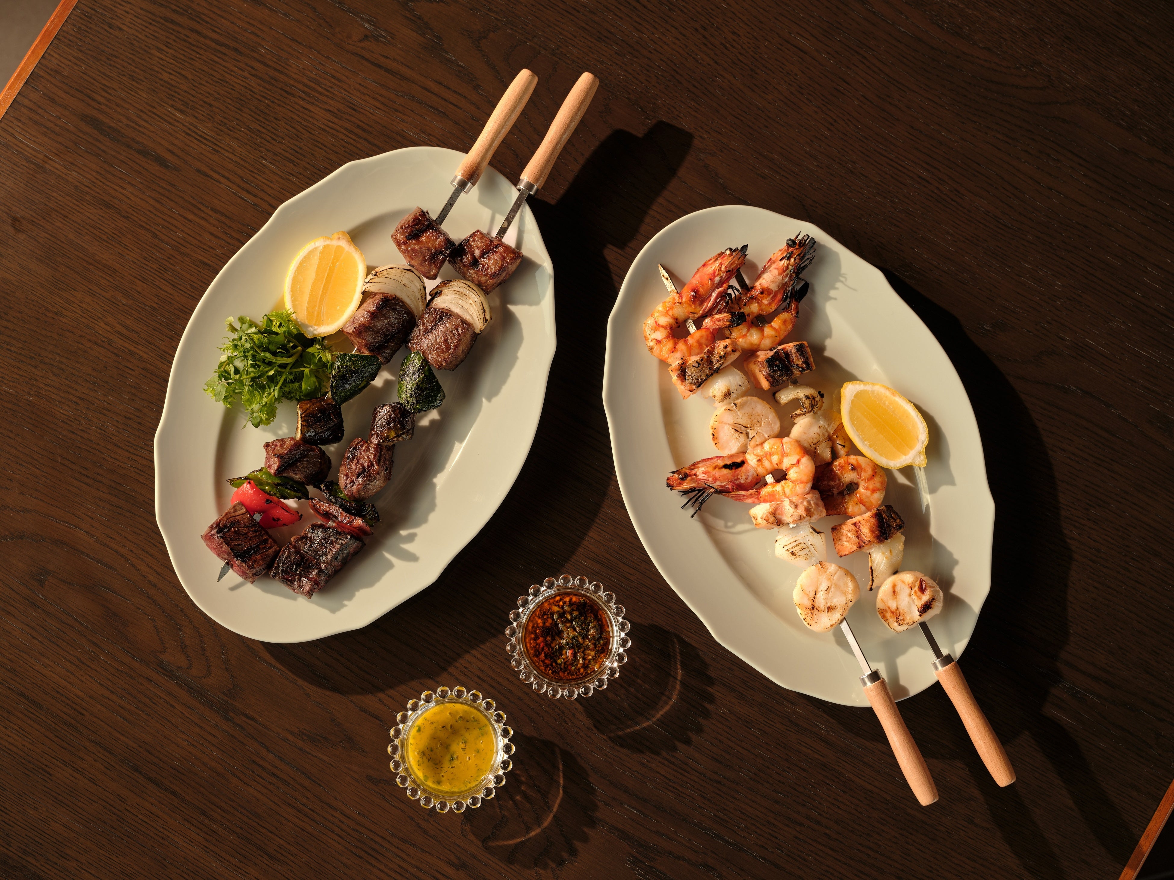 前菜には、甘みのあるトウモロコシをなめらかなムースに仕立てトルティーヤに重ね、グリルした夏野菜と生ハムを添えて、夏の訪れを軽やかに伝えます。続くスープは、ジャガイモのビシソワーズに旬の桃を合わせた、やさしい甘さと香りが広がる涼やかな一皿。魚料理には、香ばしくグリルした本日のお魚を、彩り豊かなラタトゥイユと香草を効かせたグリューネソースで爽やかに仕上げました。そして、メインディッシュには、黒樺牛やまつなが牛のグリルの他、地中海地方で親しまれるバーベキュースタイルを取り入れたブロシェットをご用意。国産牛とパプリカを合わせた「国産牛のビーフブロシェット」、または、エビ・ホタテ・イカなどの「シーフードブロシェット」の2種からお選びいただけます。香ばしい旨みを引き立てる、マンゴーやパイナップルなどのフルーツとハーブを合わせた特製ソースとともにご堪能ください。ブロシェットは、コースの一部としてはもちろん、アラカルトでもお楽しみいただけます。ご家族や親しい友人との夏のひとときに、ぜひご利用ください。